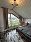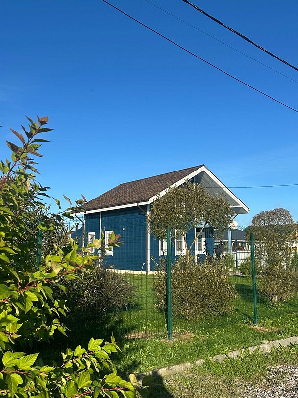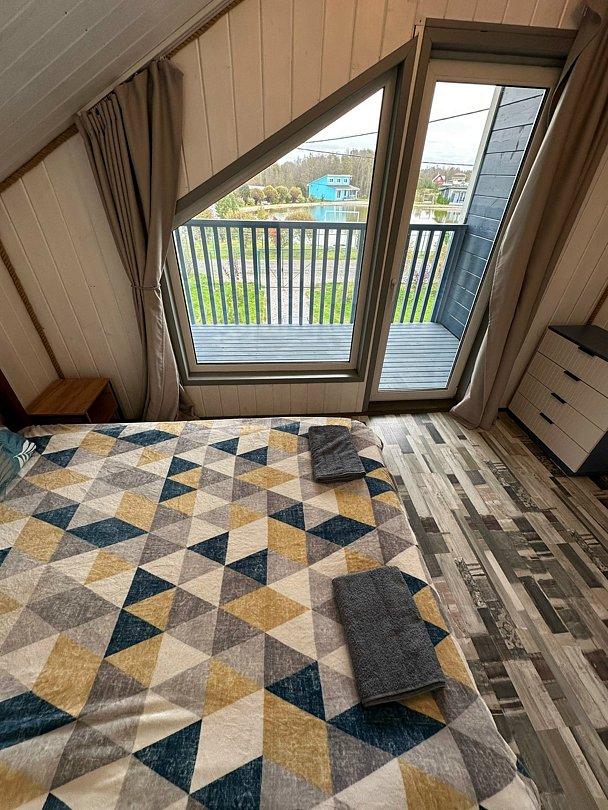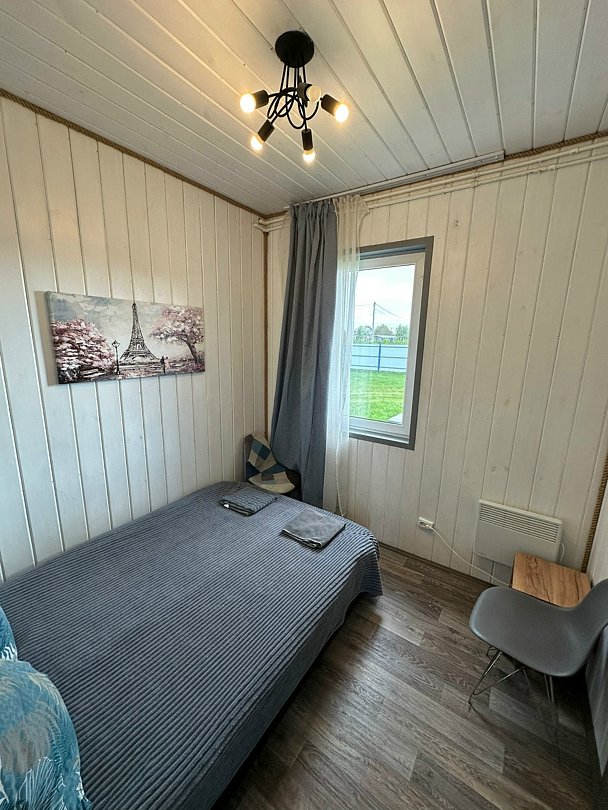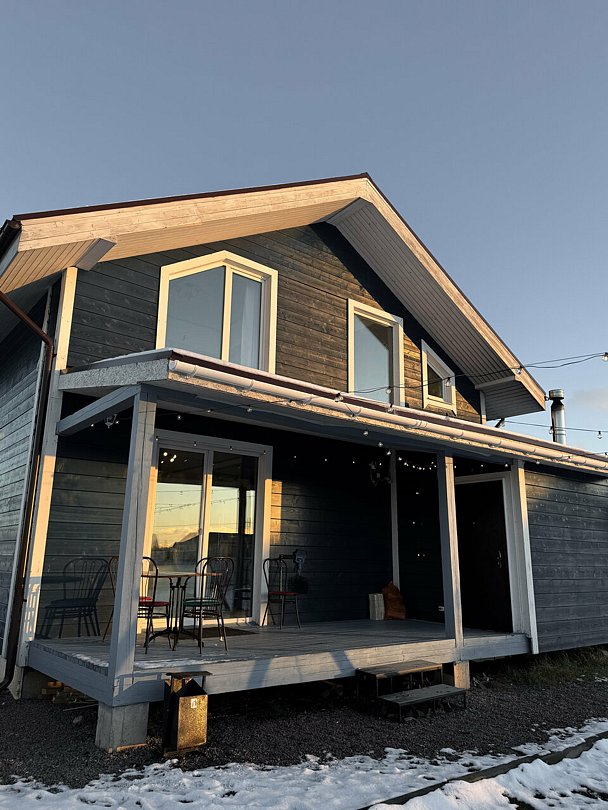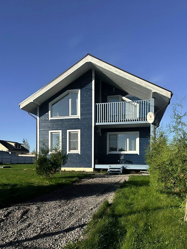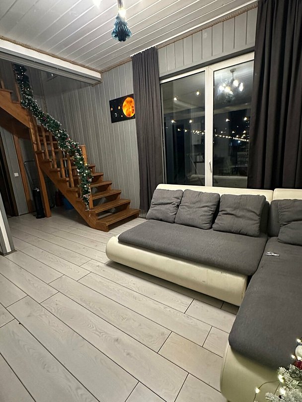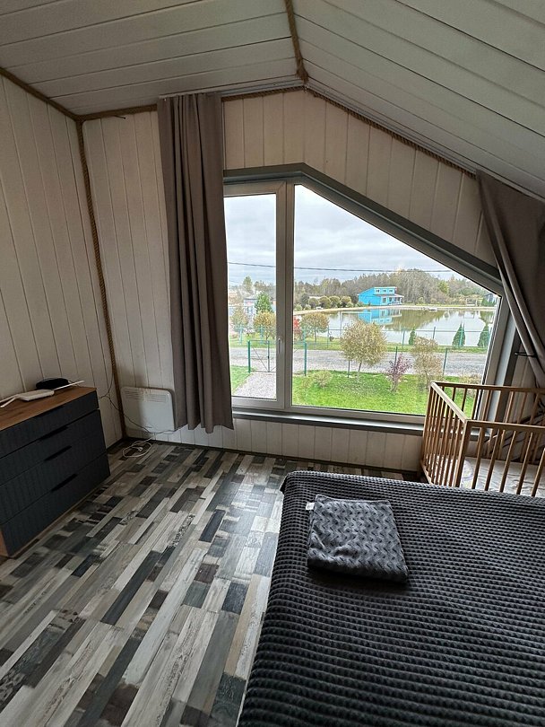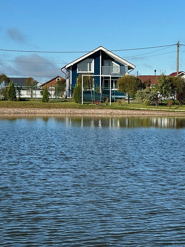 Дом на собственном закрытом участке размером в пятнадцать соток. Гостиная-кухня с панорамными окнами, откуда открывается вид на водоем и территорию. В кухне-гостиной стоит один диван. Пять изолированных спальных комнат, два санузла (в каждом есть раковина и унитаз, а в одном еще и душевая).
