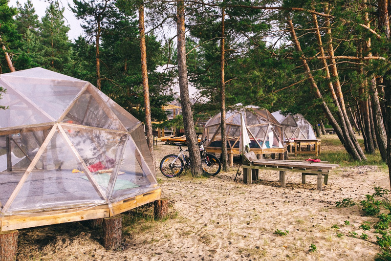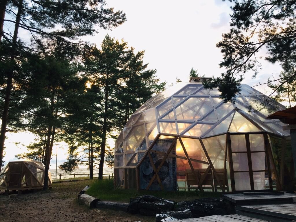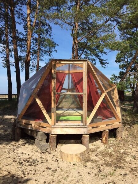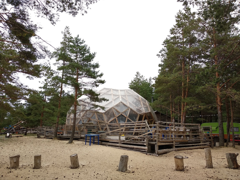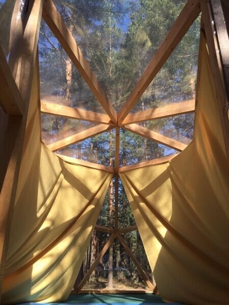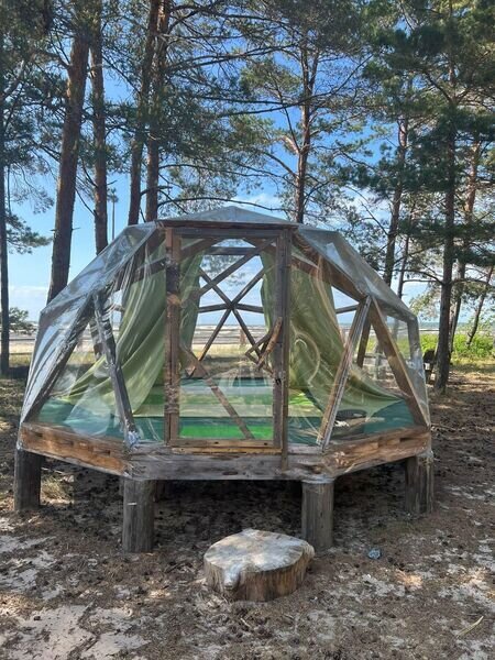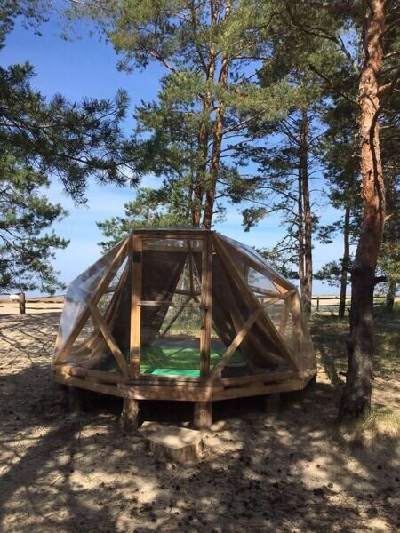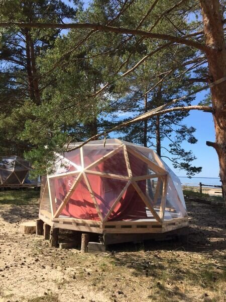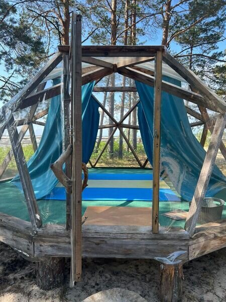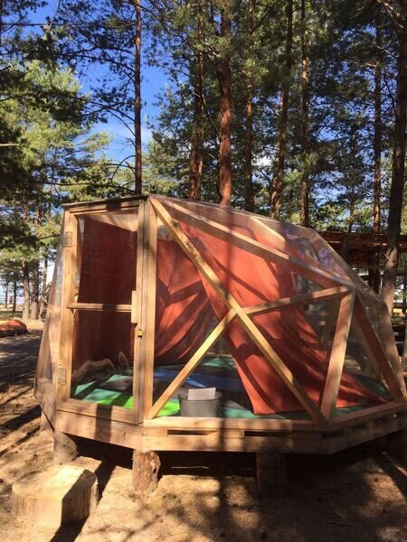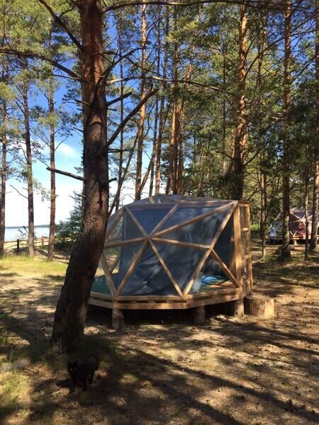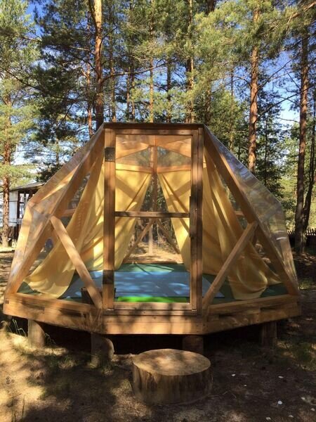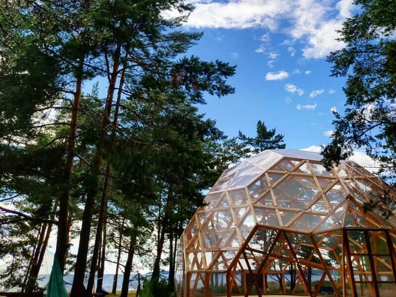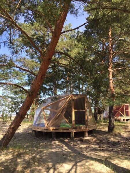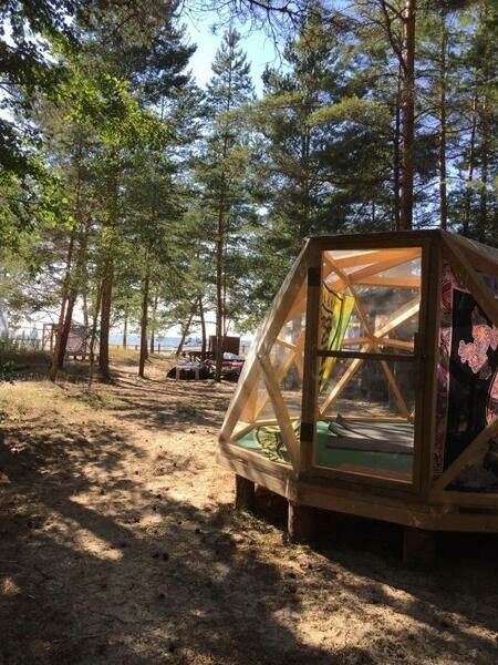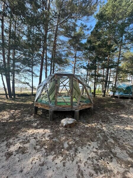 Прозрачная сфера со шторами — это уютная стационарная палатка. Размещение походное пенка и спальный мешок. Пенка входит в стоимость, а спальный мешок вы можете арендовать на базе. Есть мангальная зона.