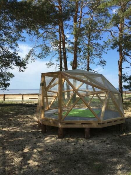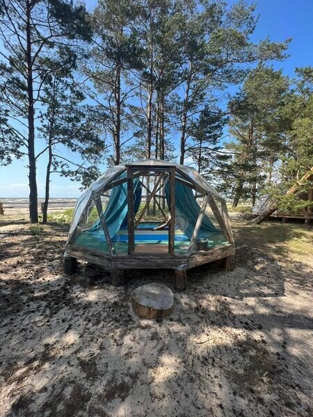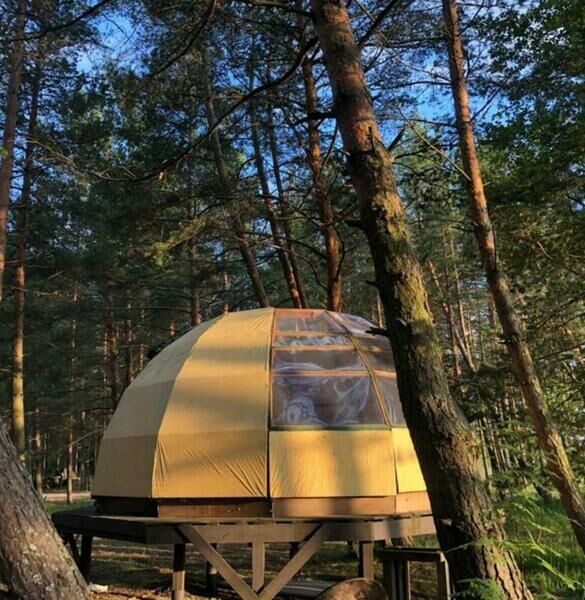 Прозрачная сфера со шторами – это уютная стационарная палатка. Размещение походное пенка и спальный мешок. Пенка входит в стоимость, а спальный мешок вы можете арендовать на базе. Есть мангальная зона.