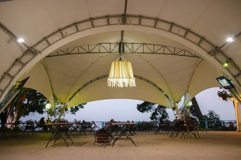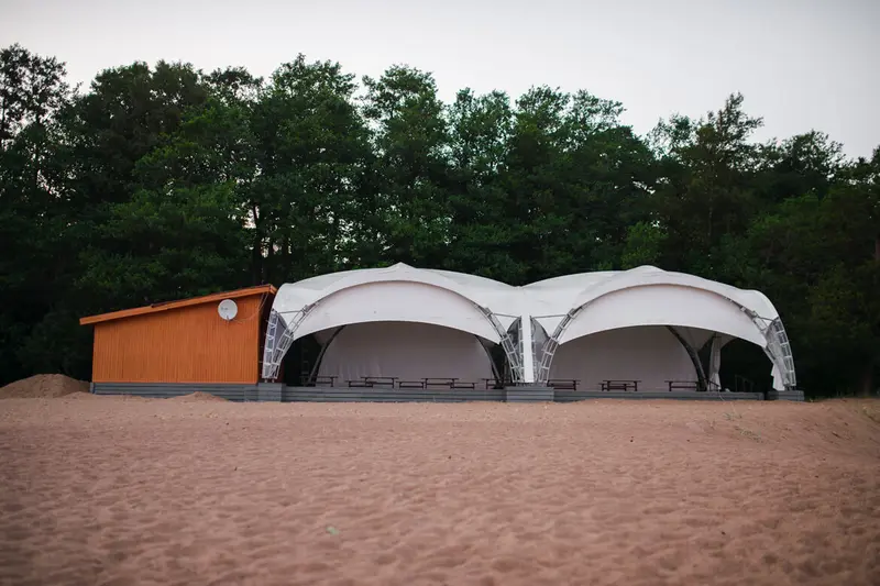На берегу под вековыми соснами расположена крытая терасса-шатер для климатотерапии, а так же для проведения торжеств, конференций, мастер-классов.