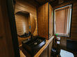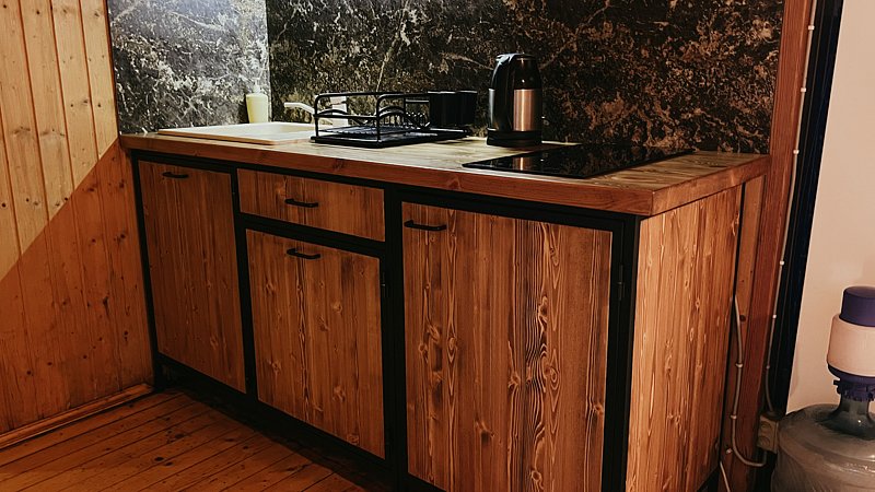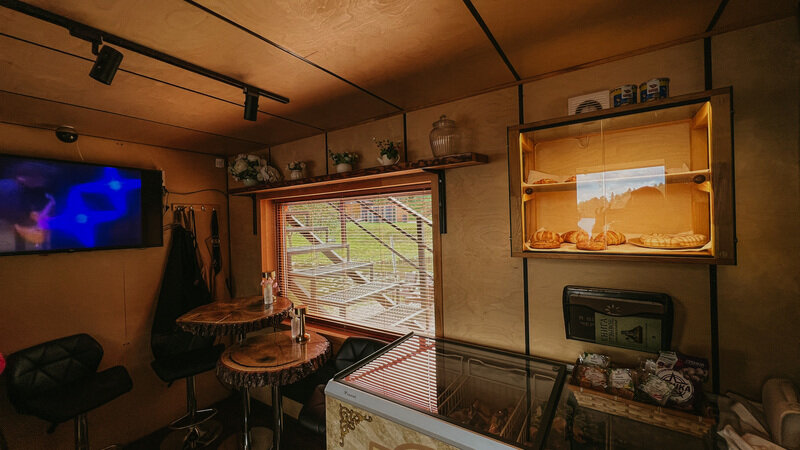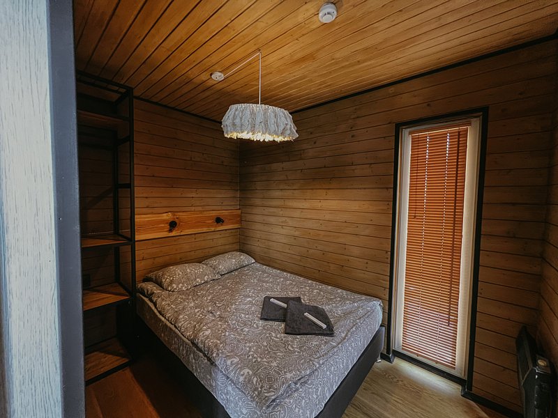 В доме двуспальная кровать отделенная шторами и диван-кровать в кухне-гостиной. В коттедже имеется: мини-кухня, чайник, микроволновка, холодильник, посуда и приборы для четверых, цифровое и смарт ТВ, интернет (Wi-Fi). Ванная комната с душевой кабинкой. На улице мангал. Рядом с домиком плавучая банька "Анчоус" (оплачивается отдельно) и прорубь.