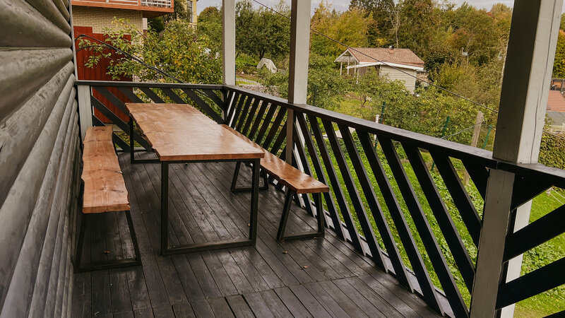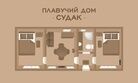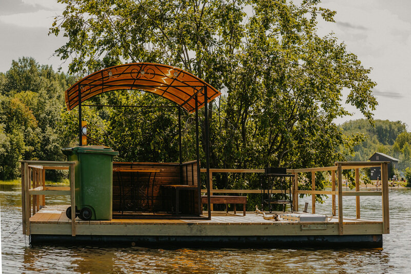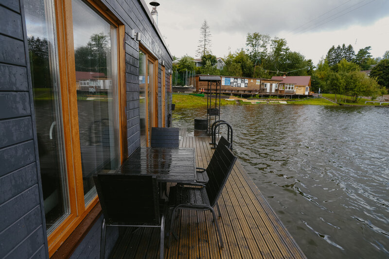 Уютный плавучий дом на 6 человек с баней, 2 спальнями, большими окнами и открытой террасой.