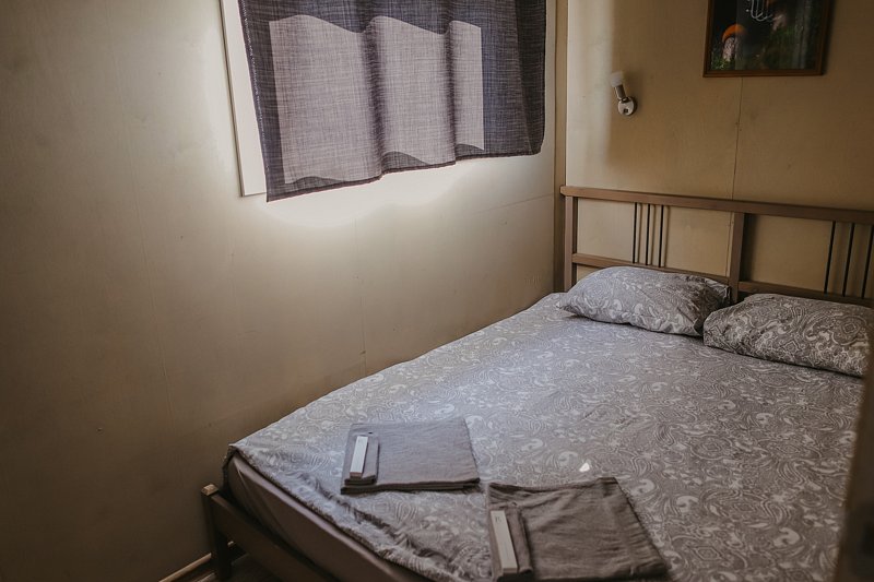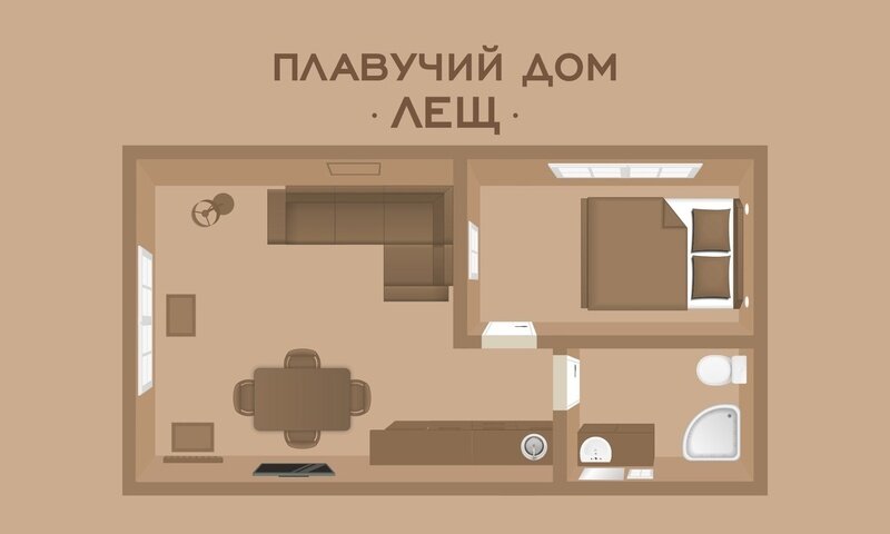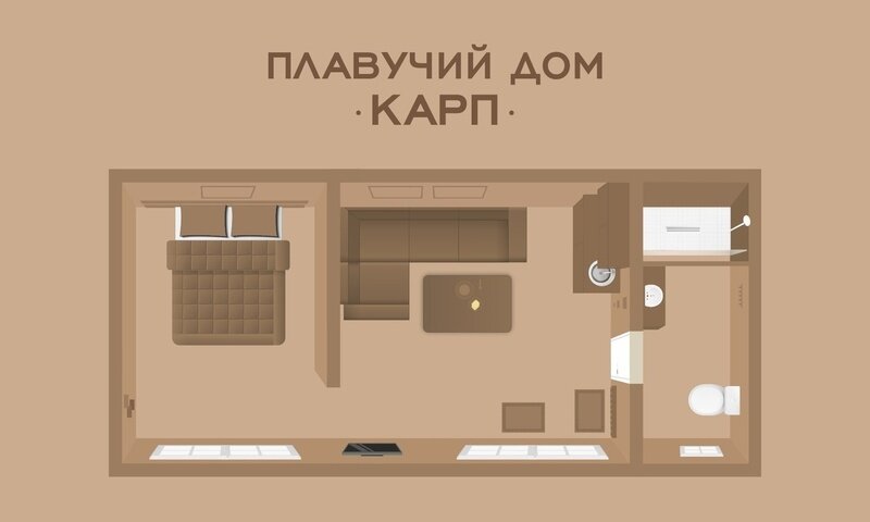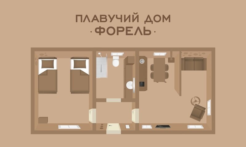Уютный плавучий коттедж на 4 человек, 1 спальня (огорожена выдвижной перегородкой), с большими окнами и открытой террасой.