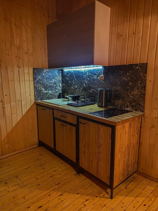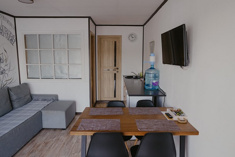 Комфортный и тёплый домик на воде с панорамным видом из кухни-гостиной и отдельной спальни. Вмещает в себя 4 человека (кровать king-size в спальне и угловой диван-кровать в гостиной).