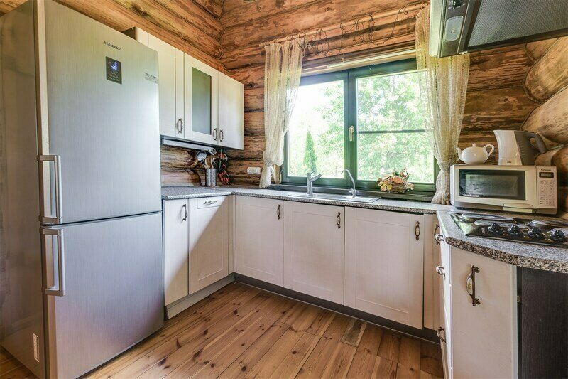 -Кухонная зона: холодильник, электрическая плита, микроволновая печь, чайник, посуда, раковина, посудомоечная машина.