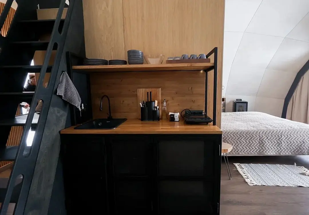 - Кухня: электрическая плита, мини-холодильник, тиабар, посуда и столовые приборы, раковина.