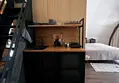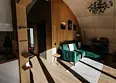 - Мебель: двуспальная кровать, полутораспальный матрас на 2 этаже, вешалка для одежды, прикроватные тумбочки, зона отдыха — кресла и журнальный столик.