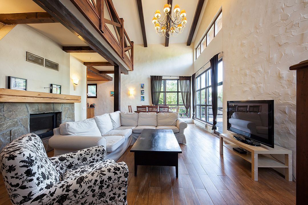 - в 50 метровой гостиной широкие от самого пола панорамные окна позволят Вам насладиться окружающим пейзажем;