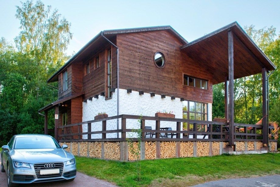 Коттедж общей площадью 200 м2 и 70 метровая терраса с деревянной мебелью. Мангальная зона возле террасы.