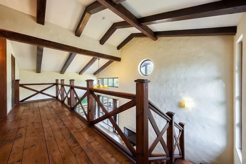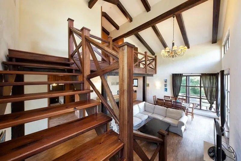 - потолок с массивными деревянными балками венчает шикарная кованная люстра;