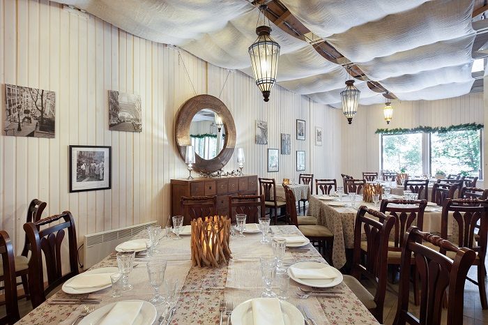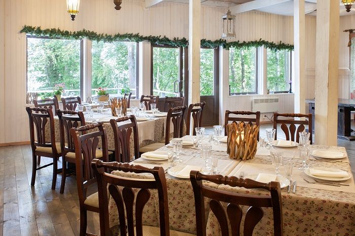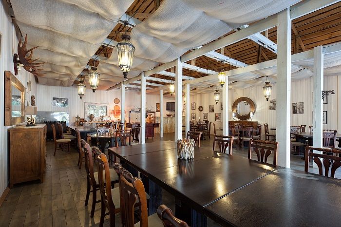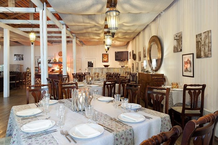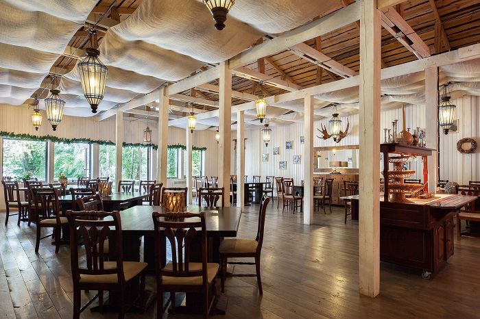 Ресторан комплекса это: уютный зал в стиле Прованс, площадью 140м² вместимостью до 60–70 человек, и летней террасой площадью 260 м² вместимостью до 100 человек, с панорамным видом на озеро, оформленный в стилистике шале. Он идеально подходит для проведения торжественных и корпоративных мероприятий.