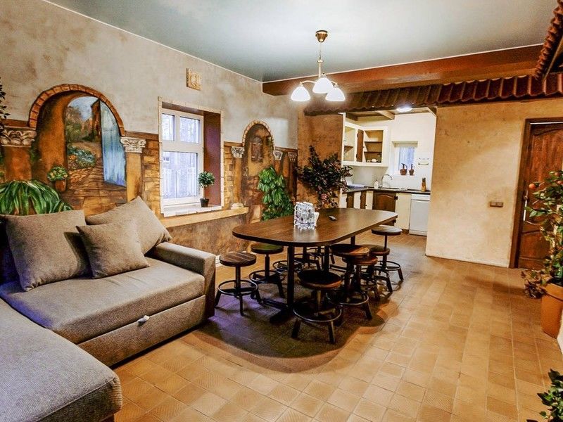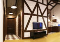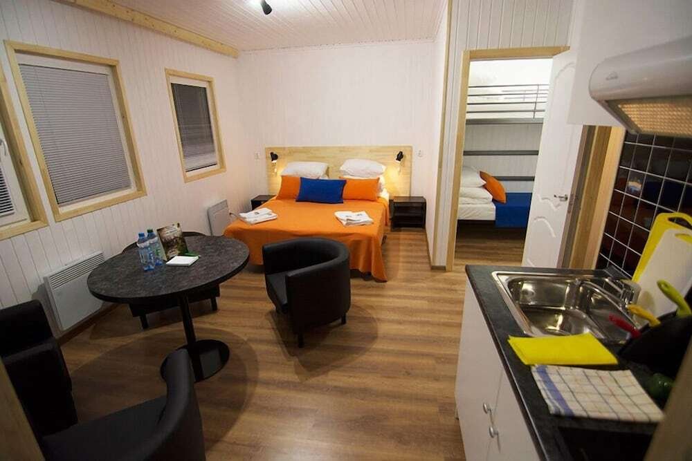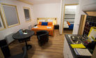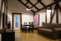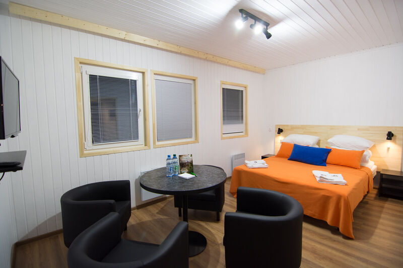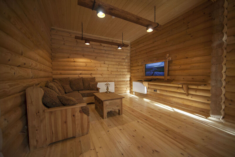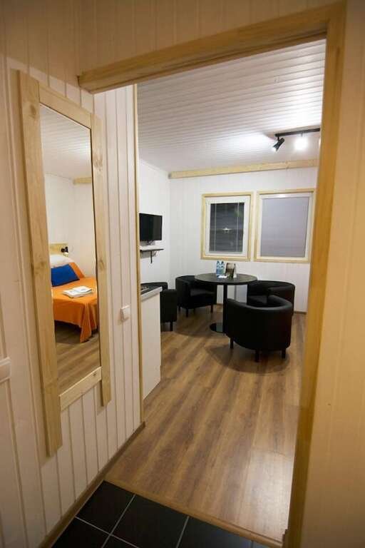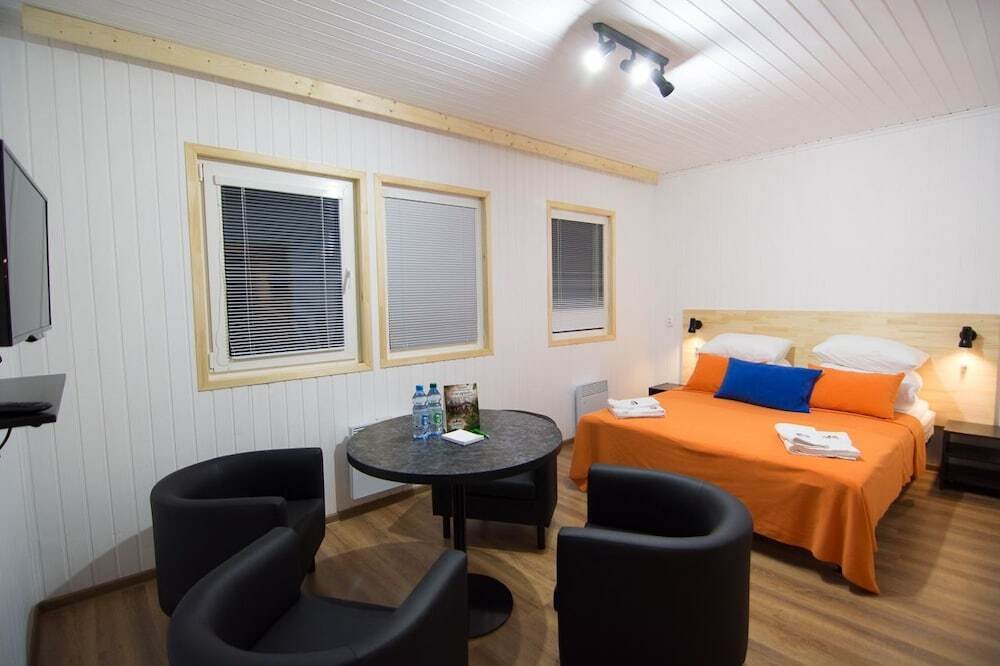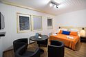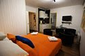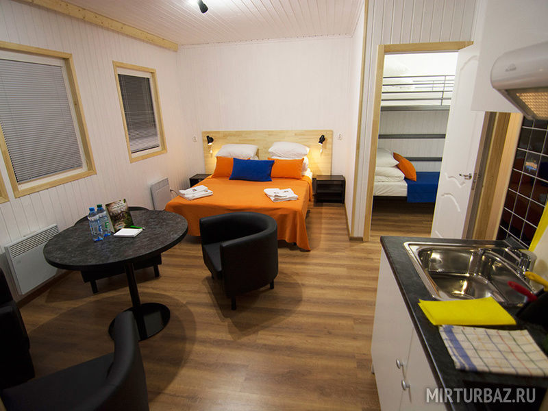 - гостиная со столом, удобными креслами, ЖК-телевизором 32" (спутниковое ТВ) и с большой двуспальной кроватью, которая при необходимости трансформируется в две раздельные кровати