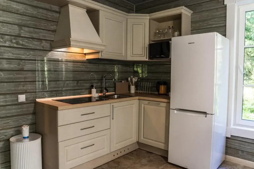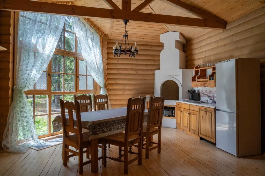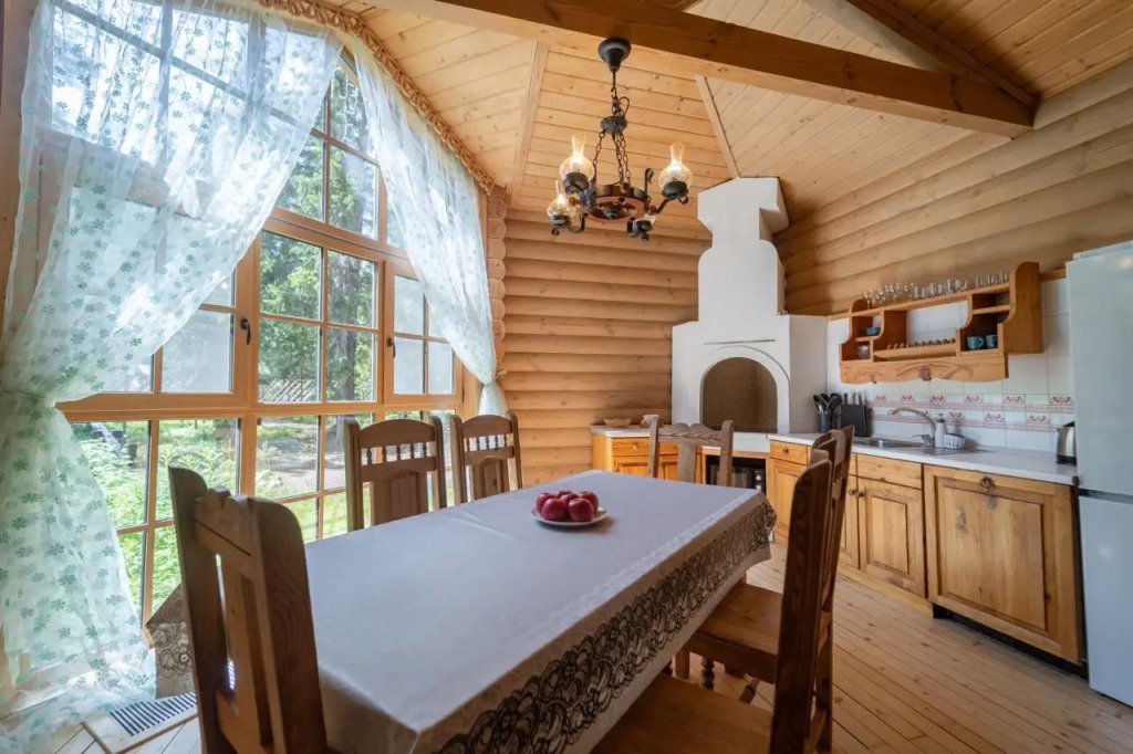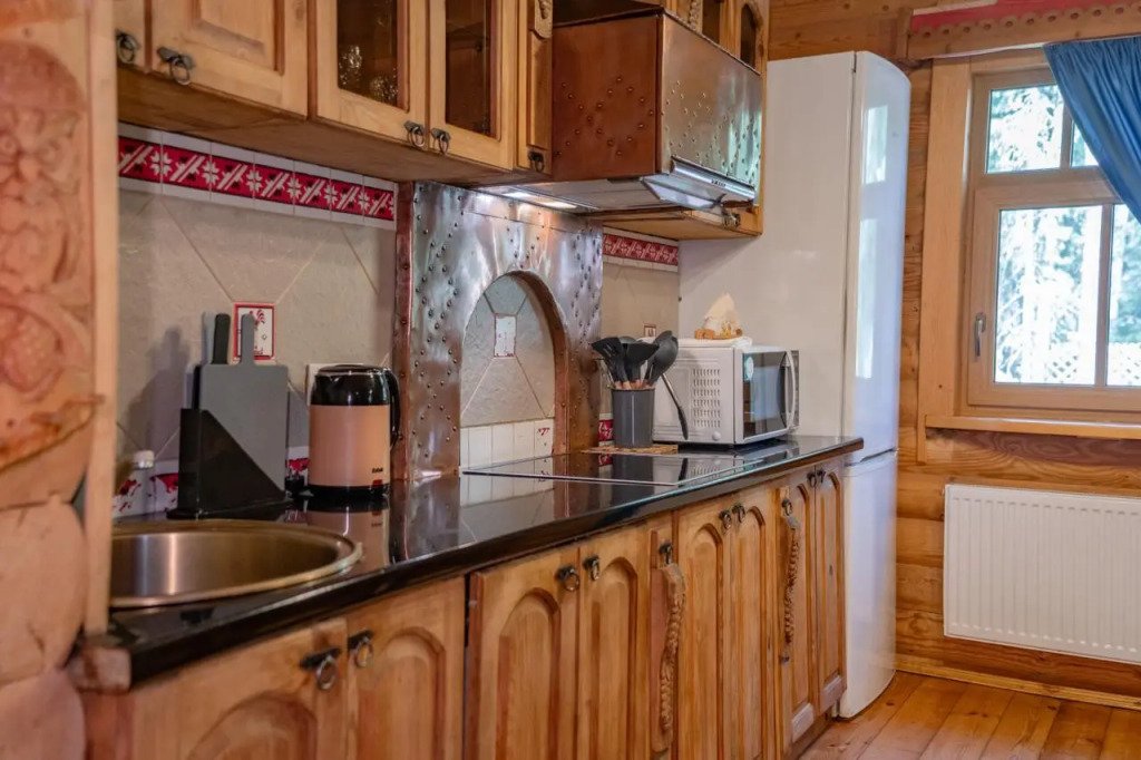 - кухня, где есть всё необходимое: холодильник, микроволновка, посудомоечная машина, варочная панель, электрический чайник, большой обеденный стол, столовые приборы, посуда;