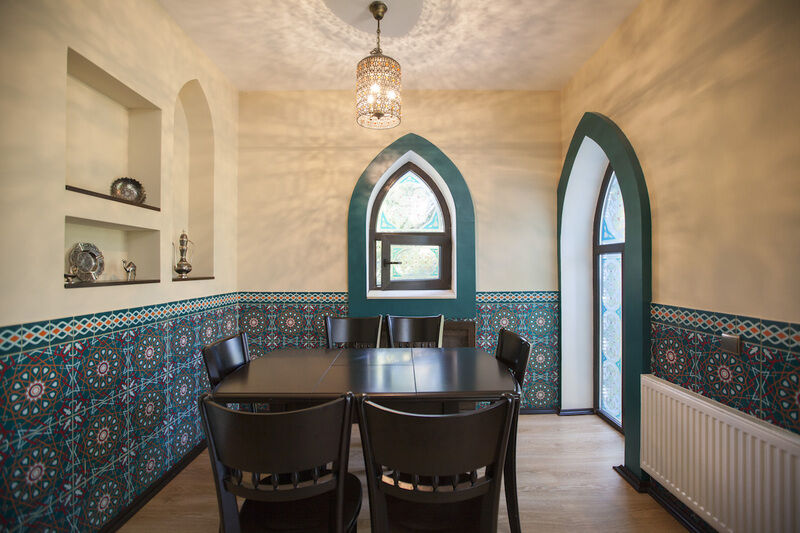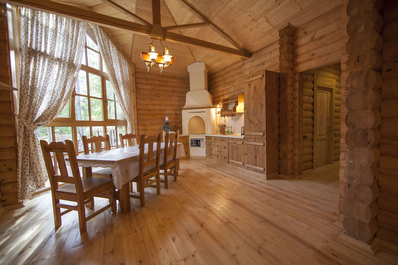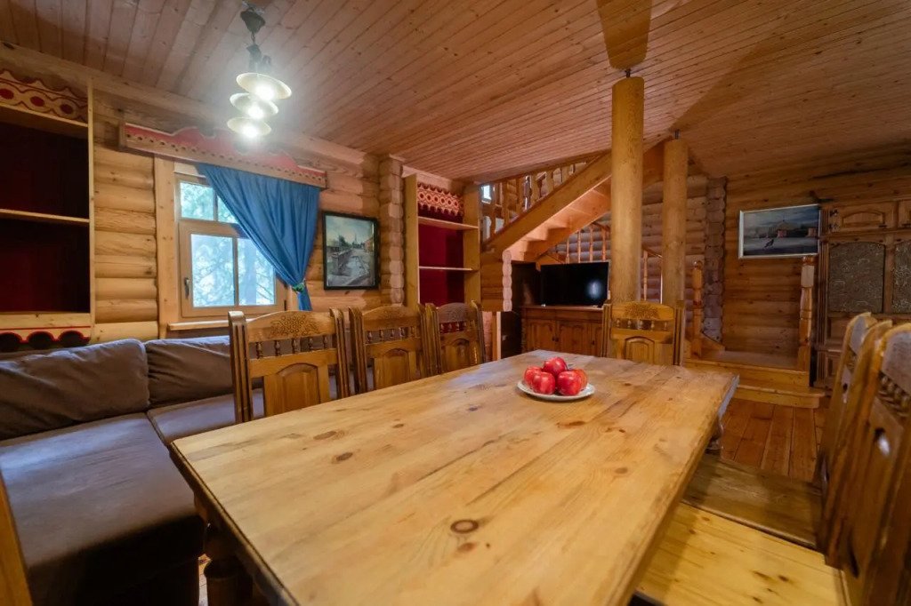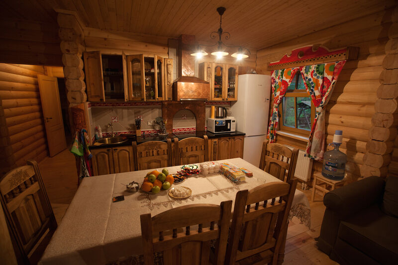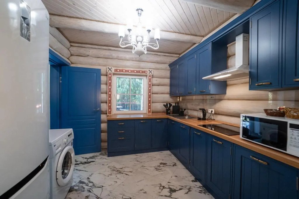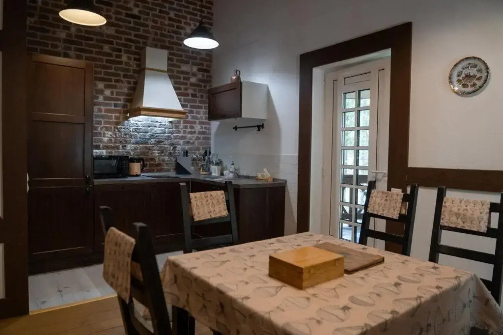 - кухня, где есть всё необходимое: холодильник, микроволновка, посудомоечная машина, варочная панель, электрический чайник, большой обеденный стол, столовые приборы, посуда;