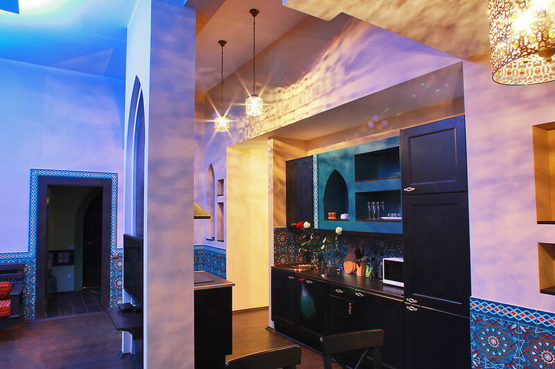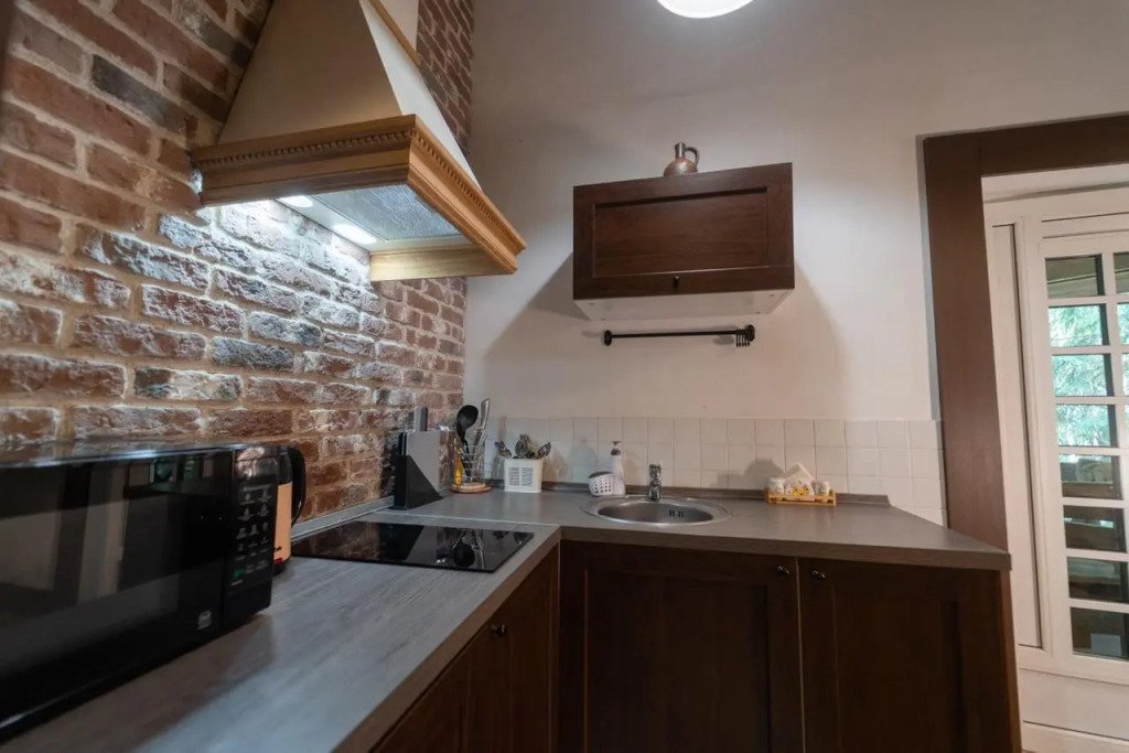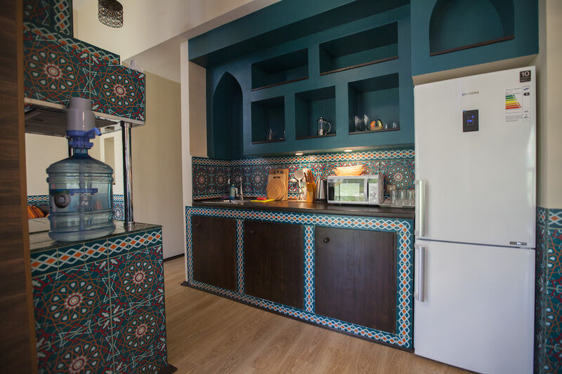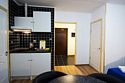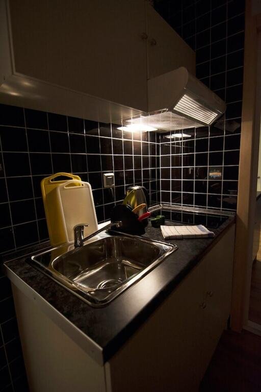 - мини-кухня, где есть все необходимое: небольшой холодильник, двухкомфорочная плита, электрический чайник, посуда;