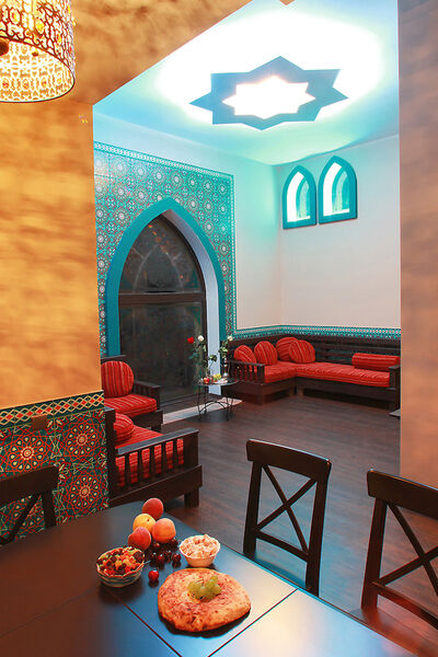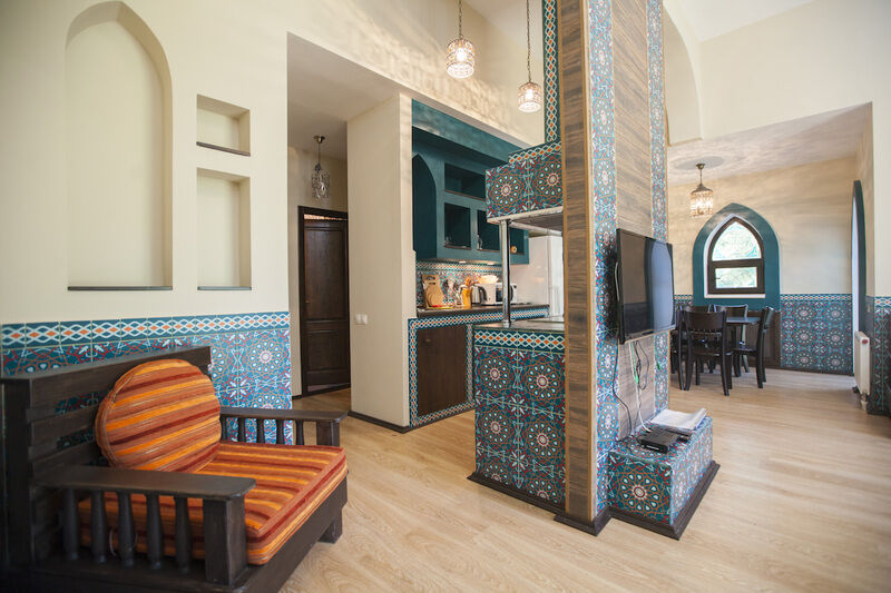 - просторная гостиная: 2 тахты, кресло, ЖК-телевизор (спутниковое ТВ);