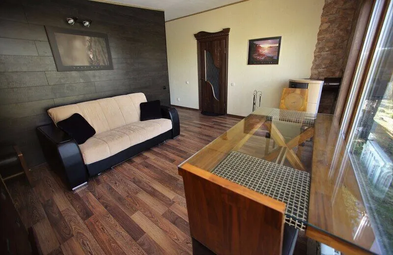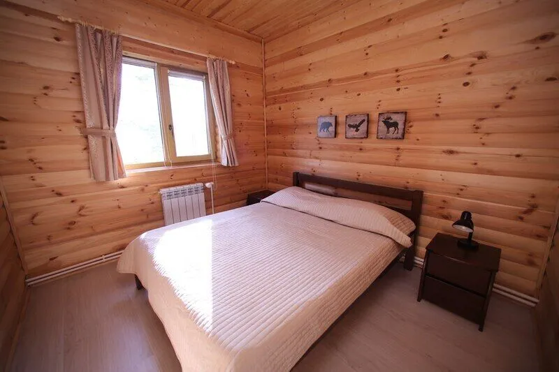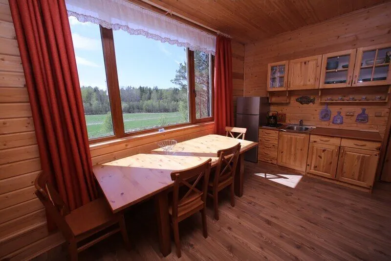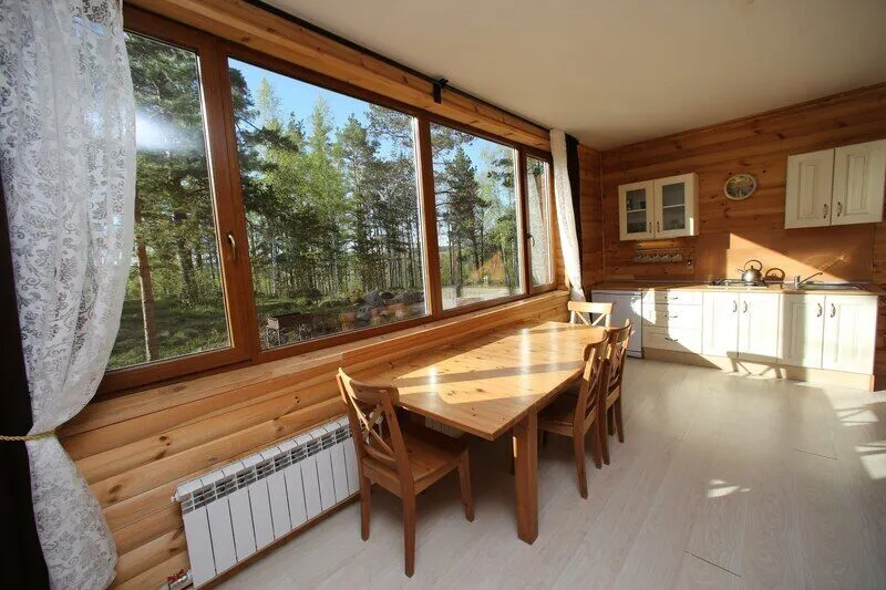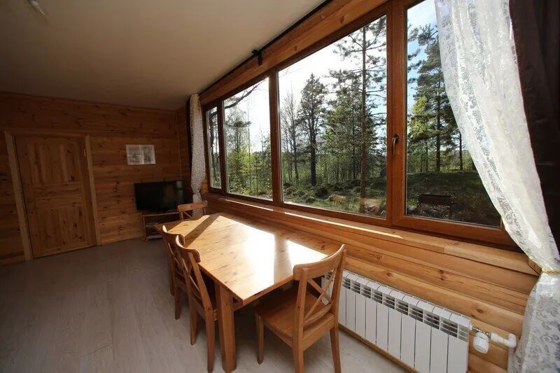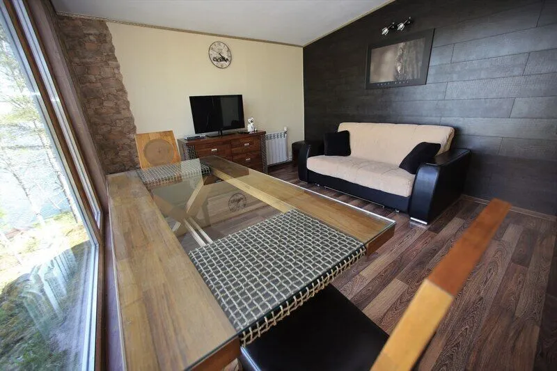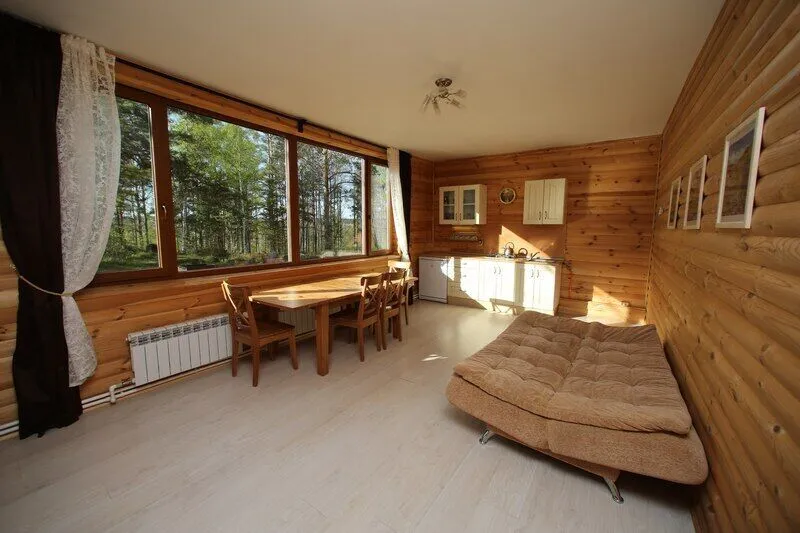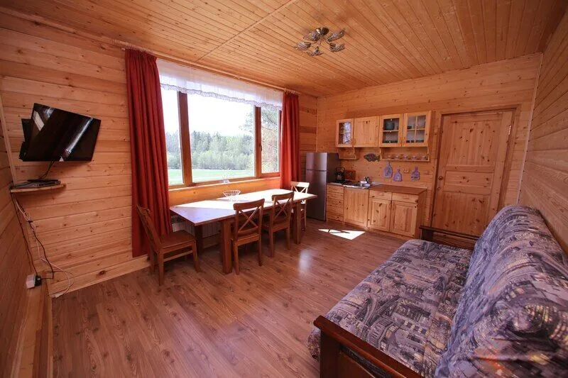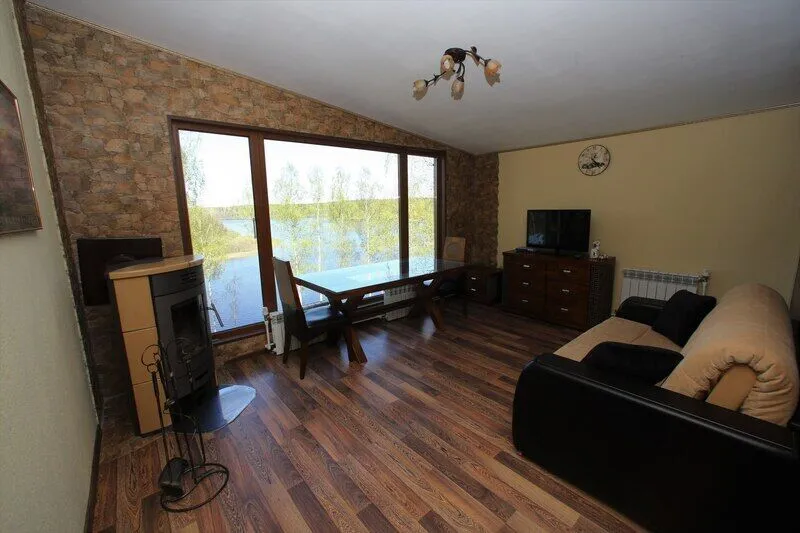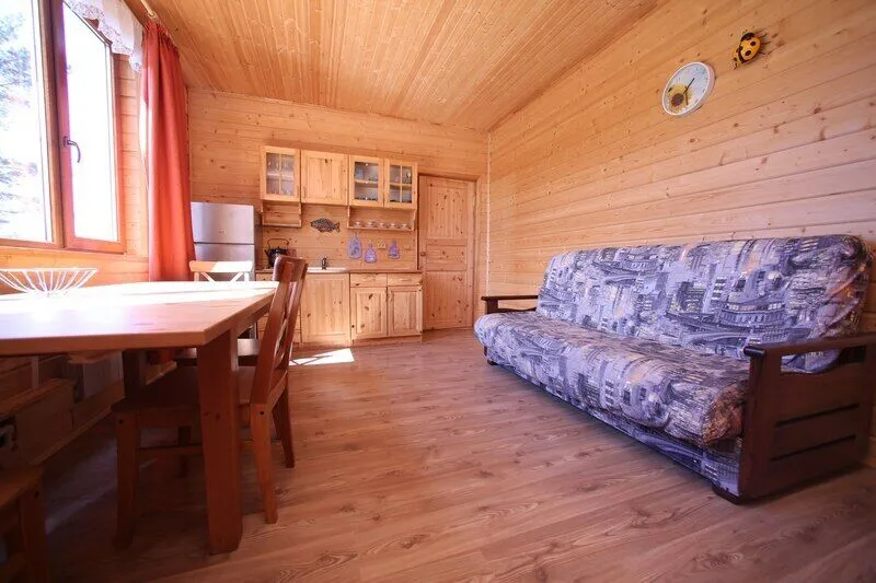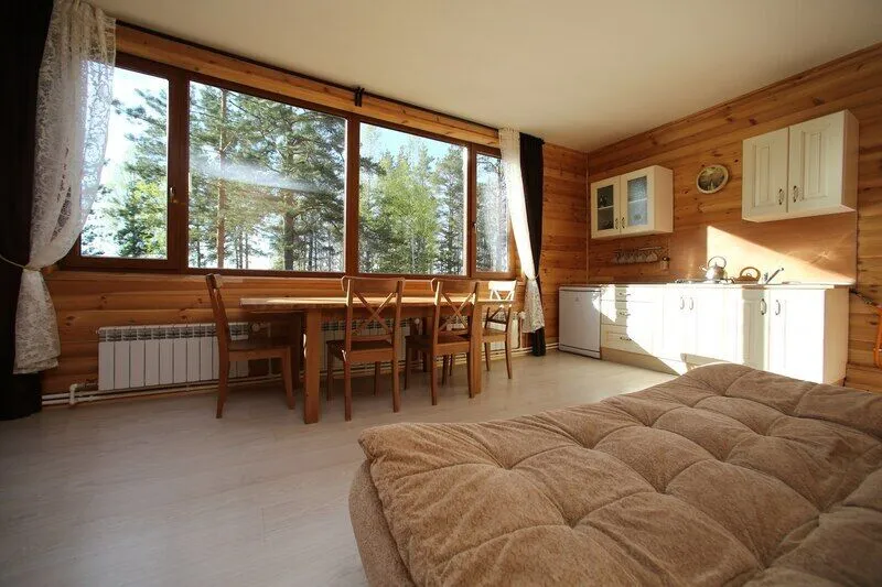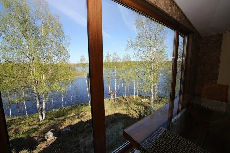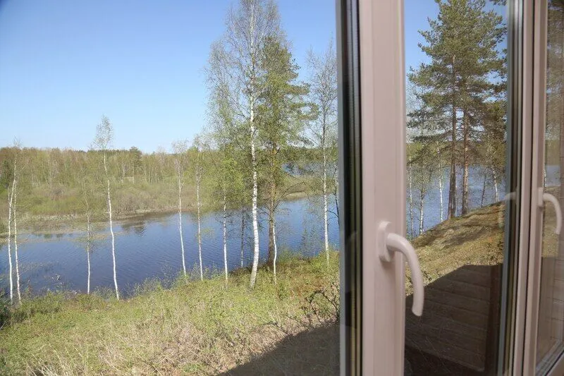 Дом со всеми удобствами. Гостиная совмещенная с кухней, две спальни (в одной двуспальная кровать), панорамные окна с видом на озеро, спутниковое ТВ, биотуалет, душ.