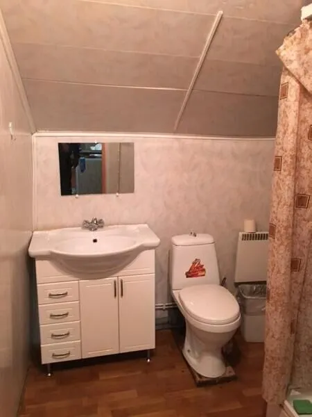 На первом этаже большая терраса (около 40 кв.м.), небольшой холл с комнатой отдыха (диван, два кресла и стол), баня с русской парной, душ. На втором этаже, гостевая с двуспальным диваном, две спальни по 8 кв.м. каждая, в 1-й спальне двуспальная кровать, во 2-й – две односпальные кровати. Санузел, электрический водонагреватель на 100 литров.