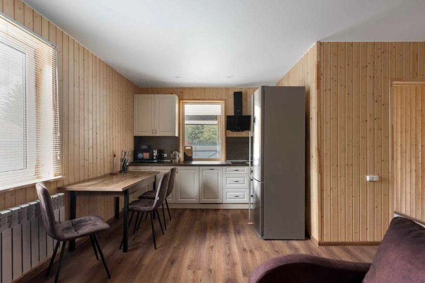 Внутри коттеджа гостей ждет все необходимое для беззаботного пребывания. Просторная кухня-гостиная оборудована современной техникой и полным набором посуды: имеется холодильник, электрическая плита, микроволновая печь и посудомоечная машина. Дом располагает тремя изолированными спальнями. На первом этаже находится ванная комната, а на втором — уютный холл с телевизором Smart TV и дополнительный санузел.