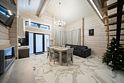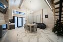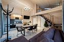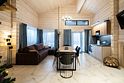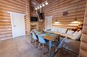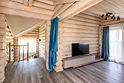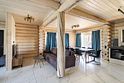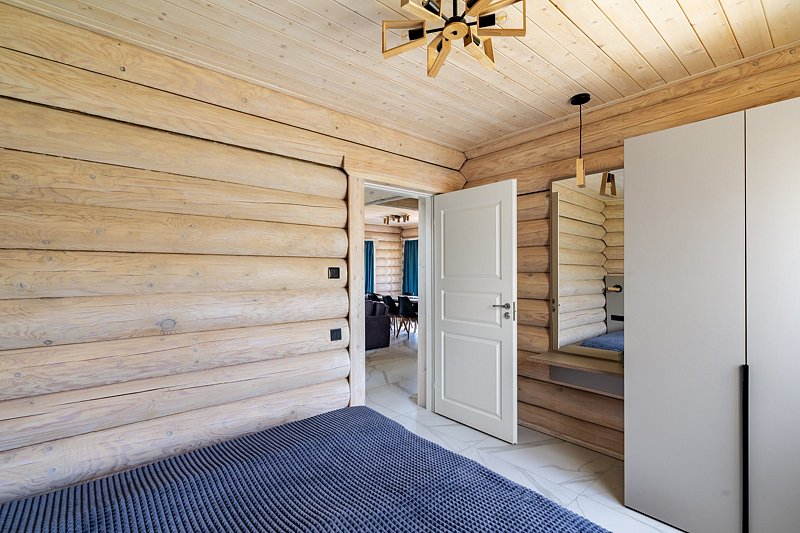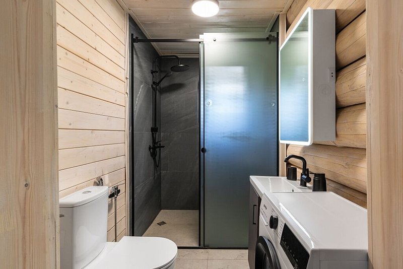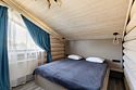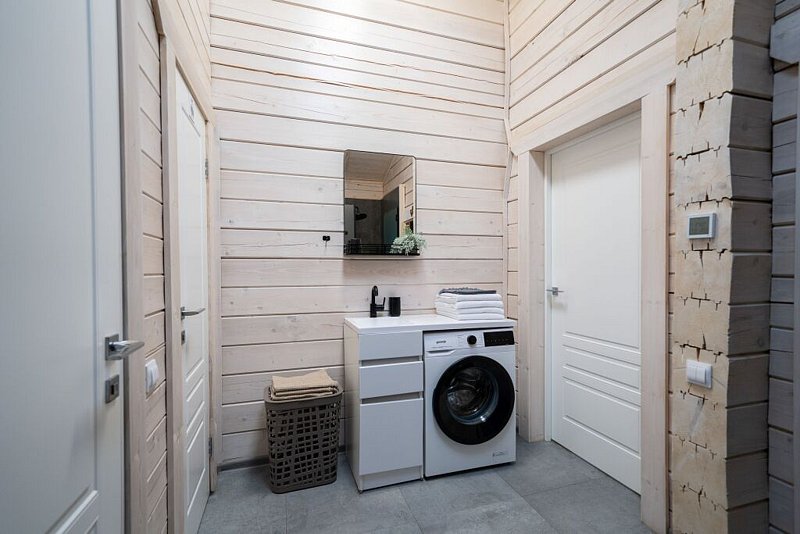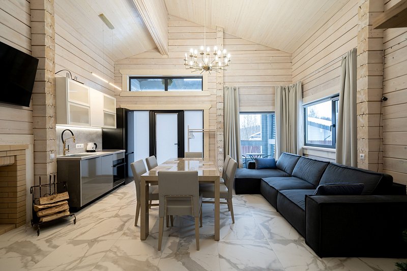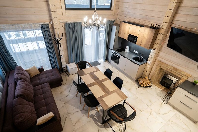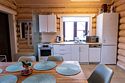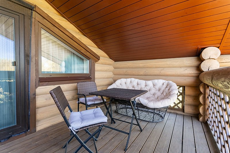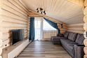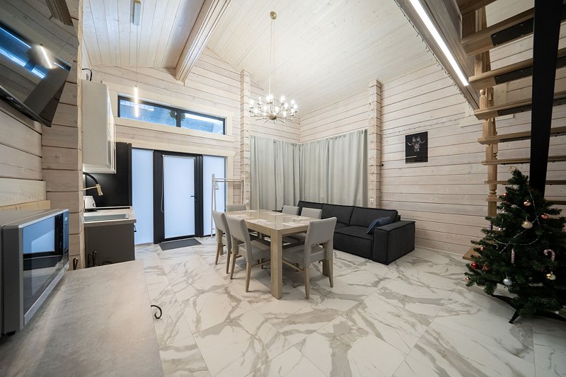 В доме имеются 2 спальни на первом и мансардном этажах и просторная кухня-гостиная с диваном, который обеспечивает еще 2 дополнительных спальных места. Кухня оборудована плитой и посудомоечной машиной, есть холодильник, чайник, кофеварка и микроволновая печь. В гостиной установлен камин, есть телевизор, спутниковое ТВ, Wi-Fi. В доме имеются 2 санузла, 2 душа, обливное ведро, стиральная машина, фен. Из душевой есть выход на террасу, на которой расположена купель, лежаки, подвесное кресло, стол и стулья.