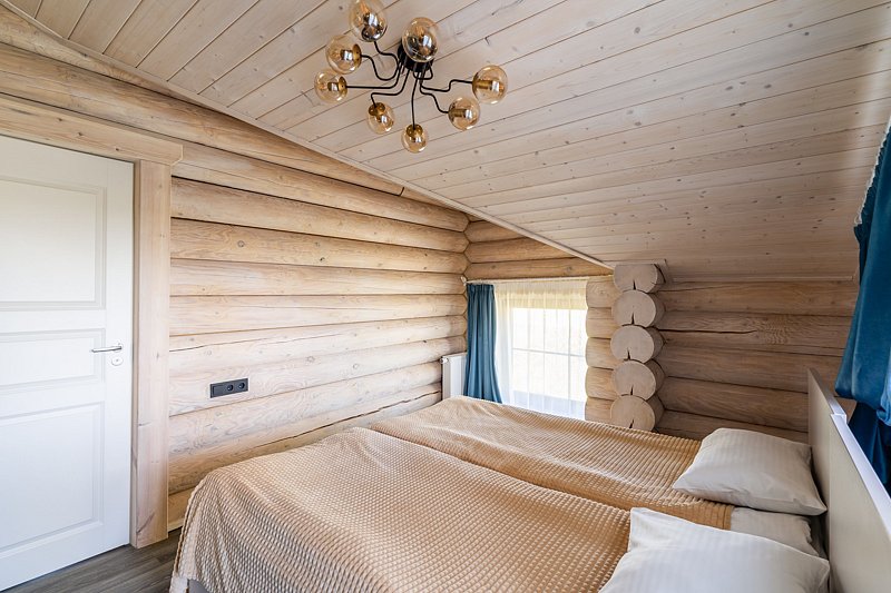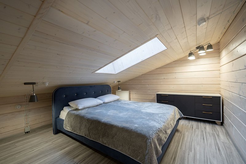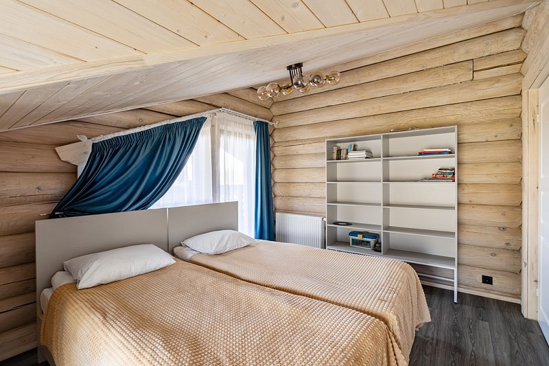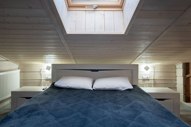 Дом из бруса с мансардным этажом, 2 спальнями, камином и баней на дровах для семьи или компании до 6 человек.