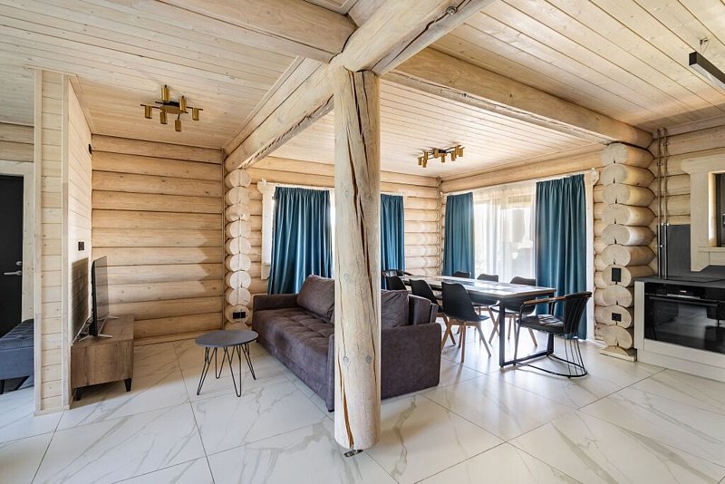 В доме имеются 2 спальни на первом и мансардном этажах и просторная кухня-гостиная с диваном, который обеспечивает еще 2 дополнительных спальных места. Кухня оборудована плитой и посудомоечной машиной, есть холодильник, чайник, кофеварка и микроволновая печь. В гостиной установлен камин, есть телевизор, цифровое ТВ, Wi-Fi. В санузле имеются 2 душа, 2 туалетные комнаты, стиральная машина, фен. Баня находится в доме и топится дровами вход через душевые. Гостям предоставляется постельное белье и полотенца.