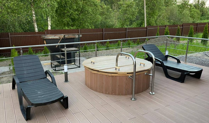 Купель расположена на террасе. Вы можете окунуться в нее после бани или освежиться в прохладной воде в жаркий летний день.