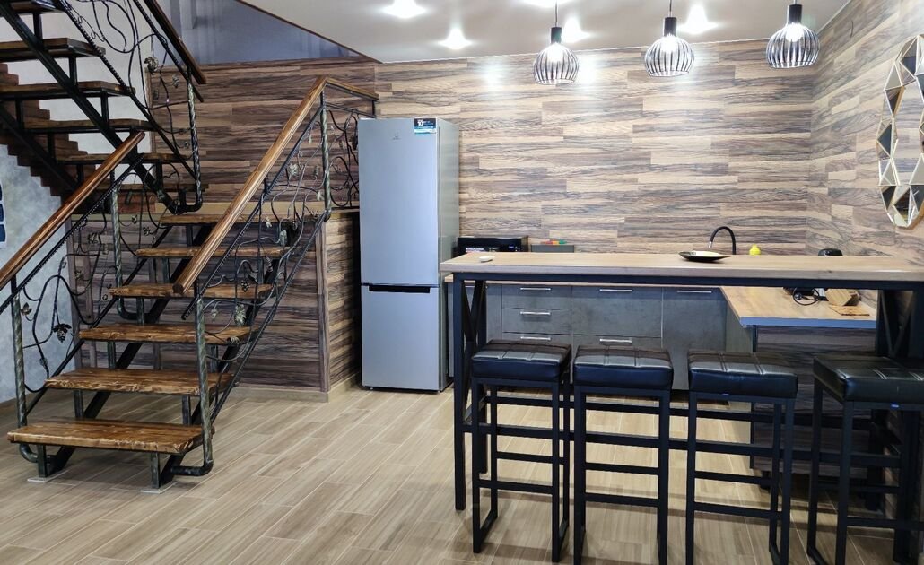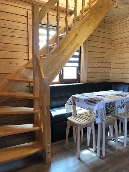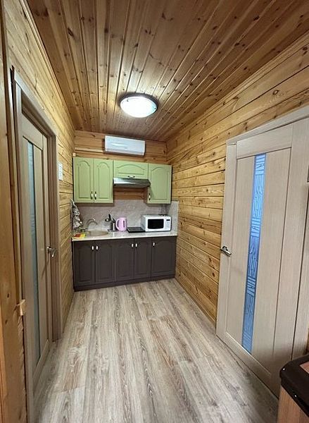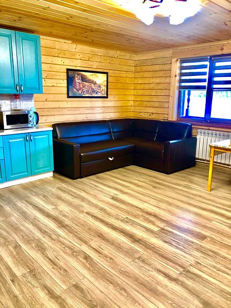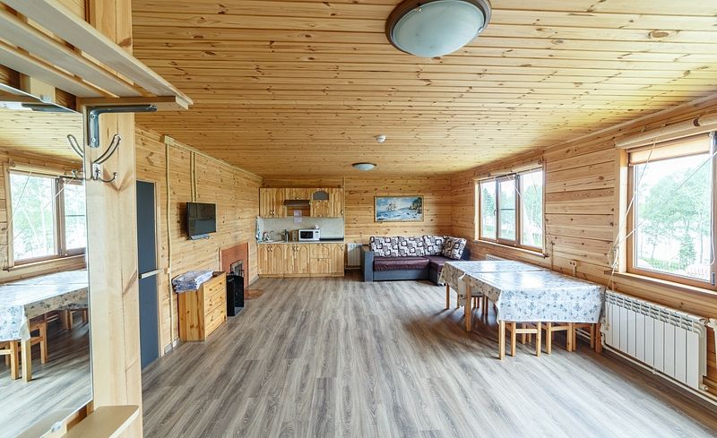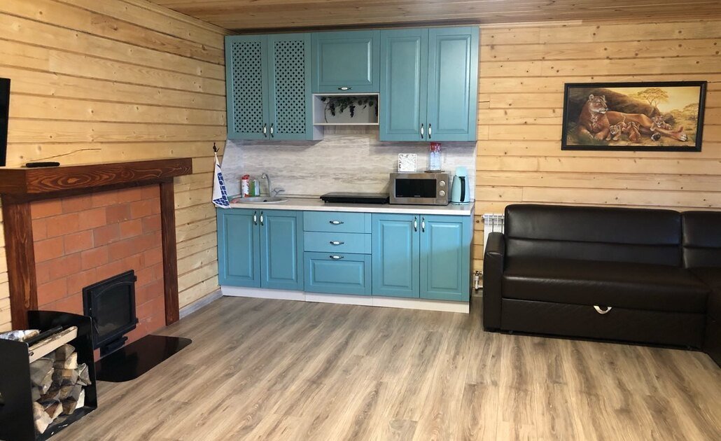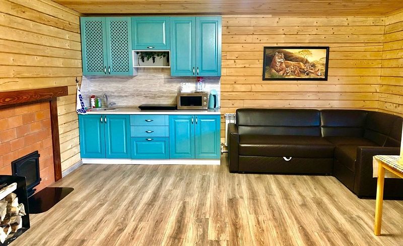 Современный коттедж оборудован всем необходимым для комфортного пребывания у нас. Большая кухня-гостиная с обеденным столом позволит вместиться небольшой компании. На кухне есть микроволновая печь, чайник, индукционная плита, посуда, маленький холодильник.