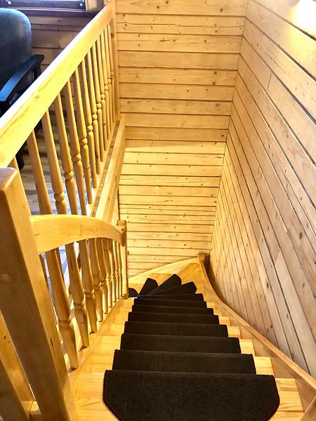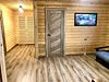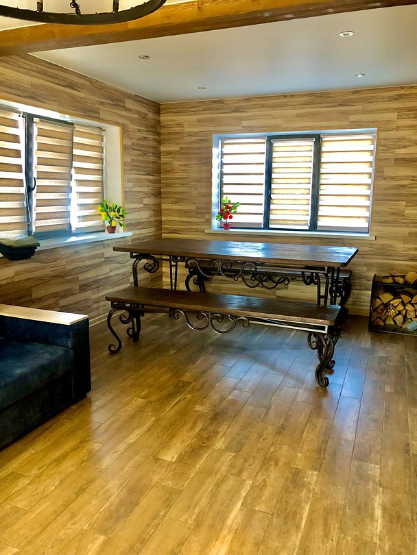На первом этаже: располагается холл с двуспальным раскладным диваном (на 2-х человек), кухня, оснащенная всем необходимым для комфортного прибывания, обеденный стол для большой компании, телевизор, комод, камин, туалет и две душевые. Парная также находится на первом этаже.