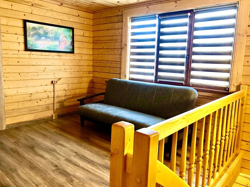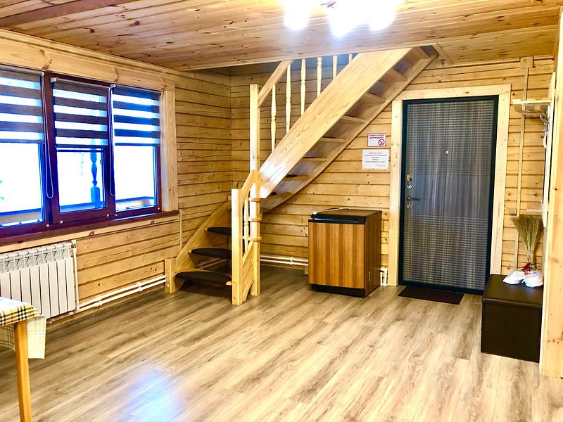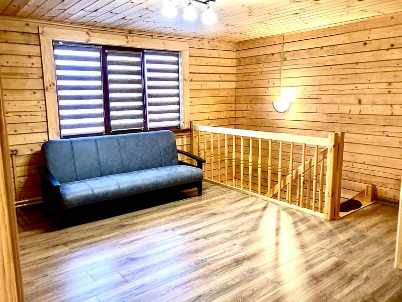 На втором этаже: также располагается большой холл, что позволяет разместить дополнительные спальные места (стоимость дополнительного размещения уточнять у администраторов), диван раскладной (на двух человек), два кресла.