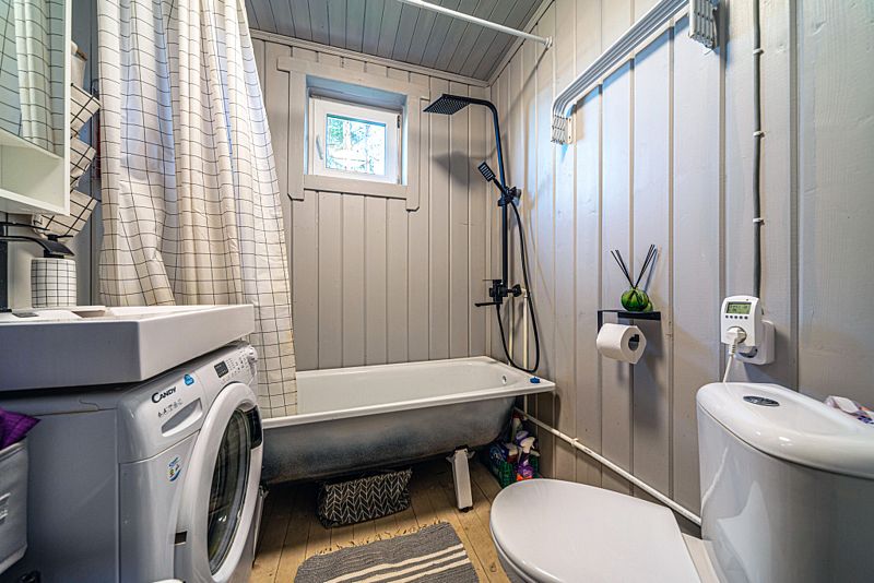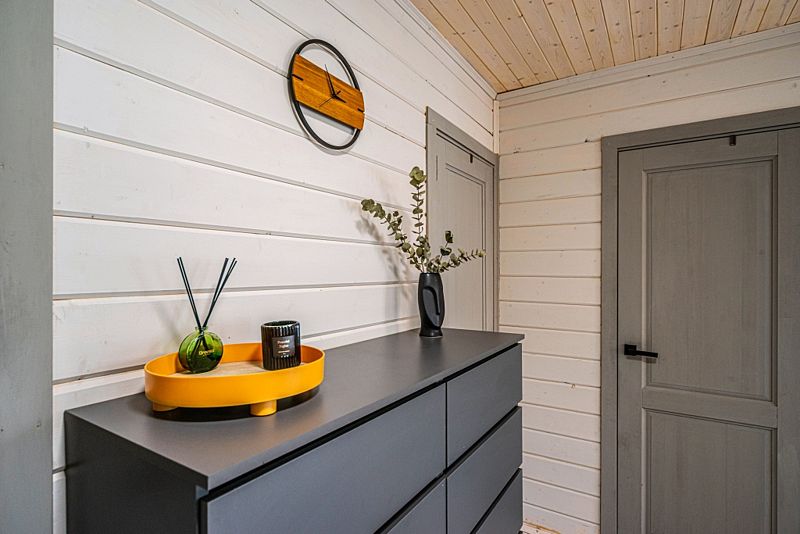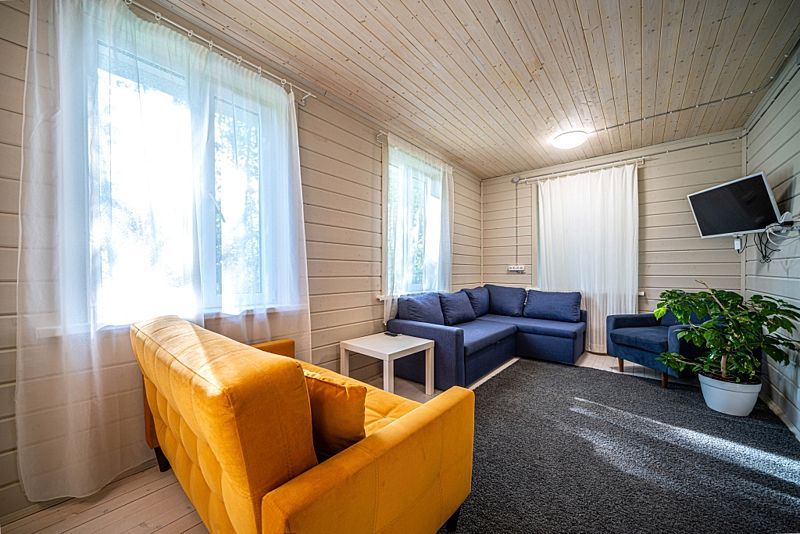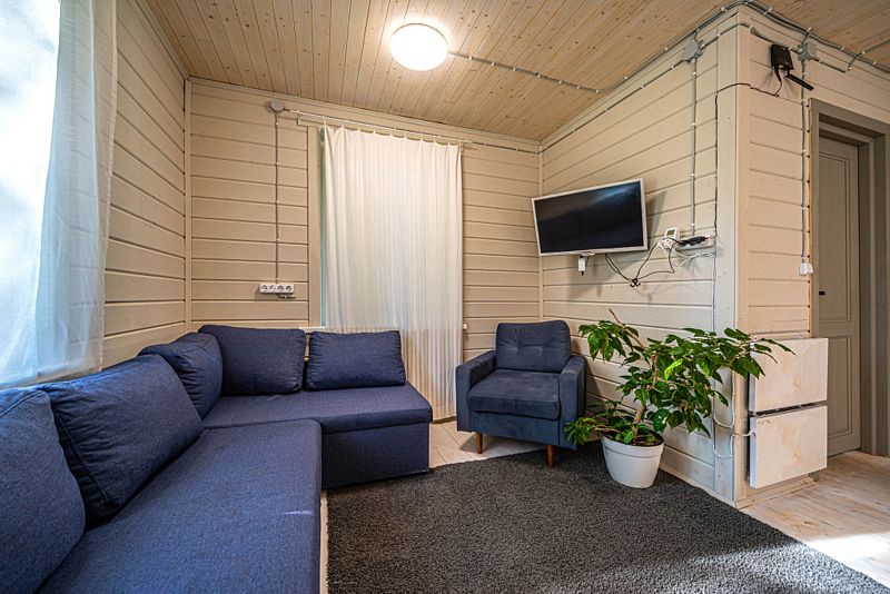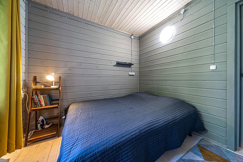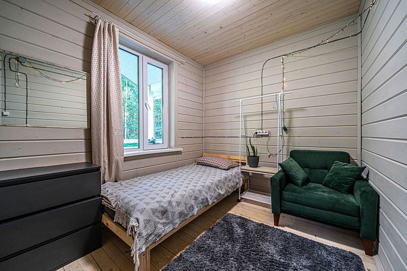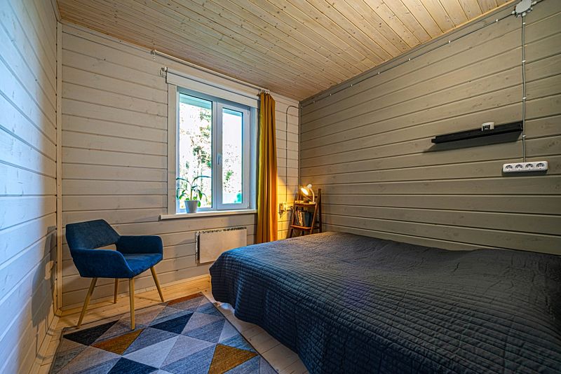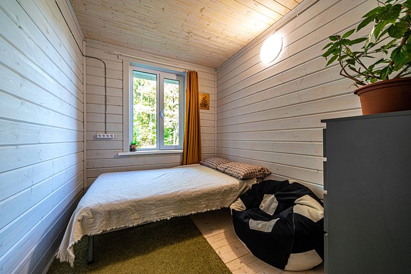 Дом 80 кв.м, участок 10 соток с соснами. В доме есть три небольшие спальни и просторная кухня-гостиная. Ванна и туалет находятся в доме, горячая вода от бойлера. Дом поддерживает тепло по системе «умный дом». Имеется большая веранда с качелью и обеденной зоной, гамак и мангал с дровами. В 5 метрах от веранды — прямой выход в лес.