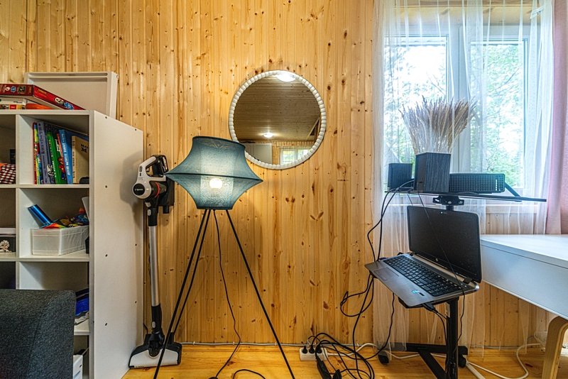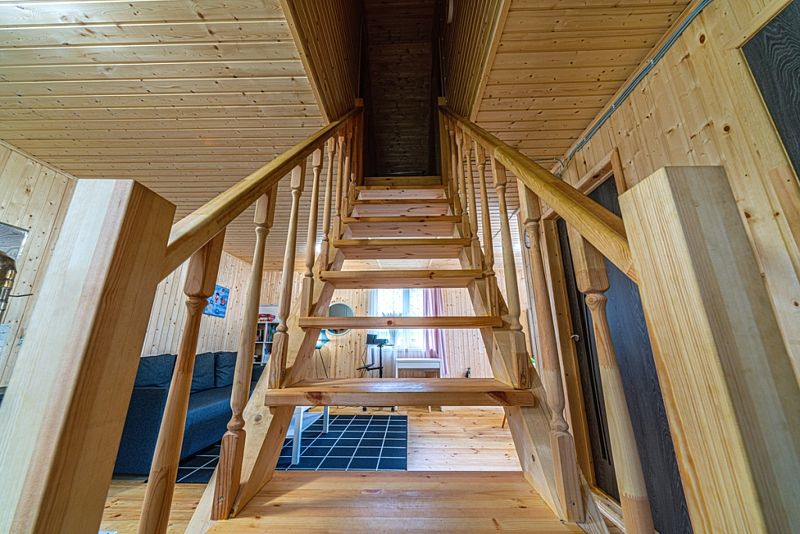 Большая гостиная занимает весь первый этаж. Здесь столовая, кухня, посудомойка и микроволновка, большой раскладной диван, и рабочая зона с ноутбуком. На втором этаже одна спальня с двухместной кроватью, другая — с двумя одноместными. Санузел с бойлером, средства для душа, постельное бельё, полотенца и стиральная машинка.
