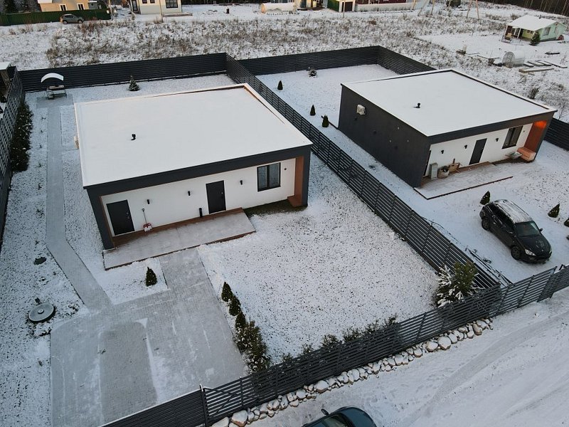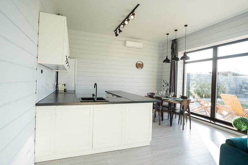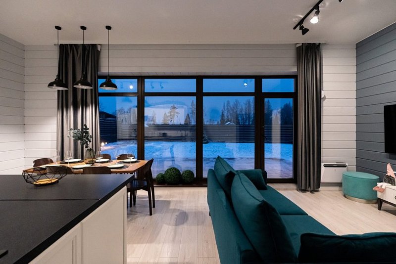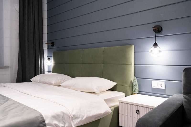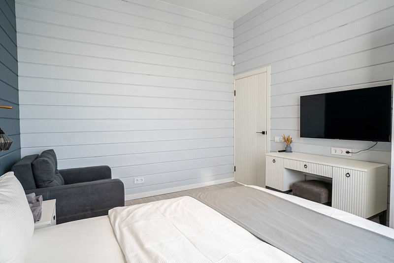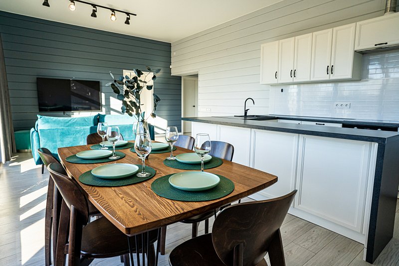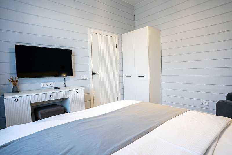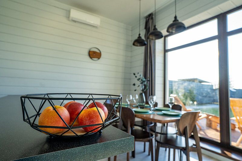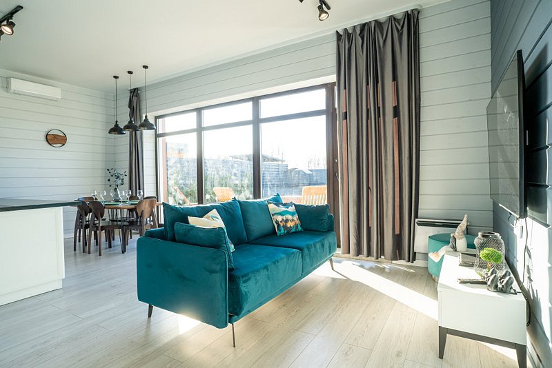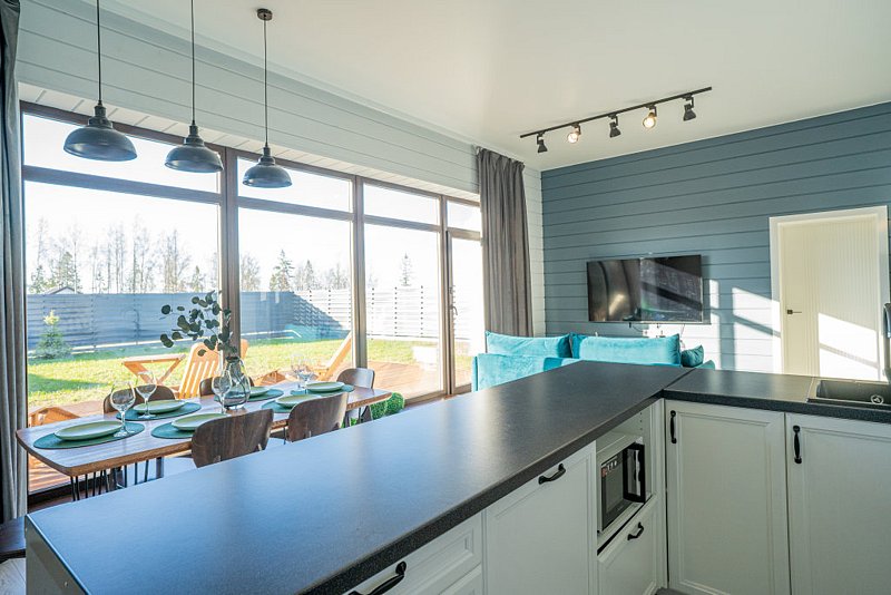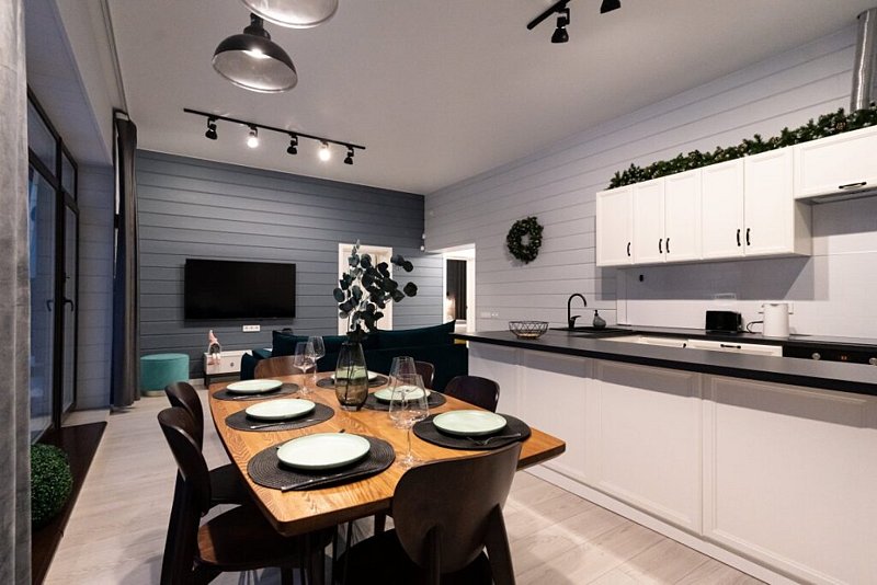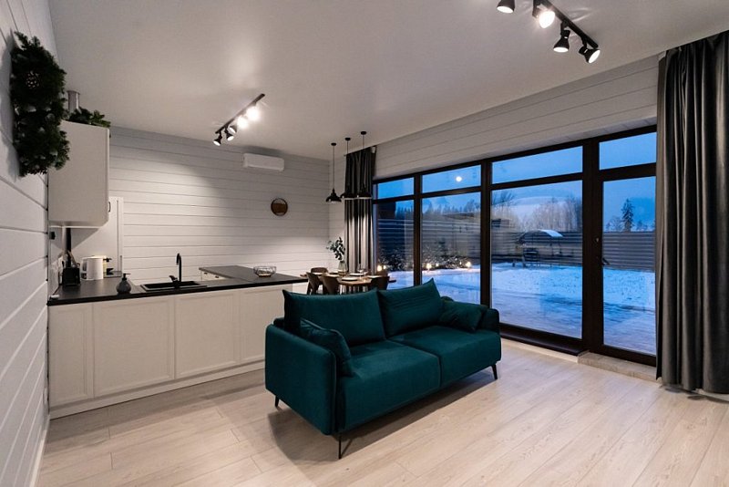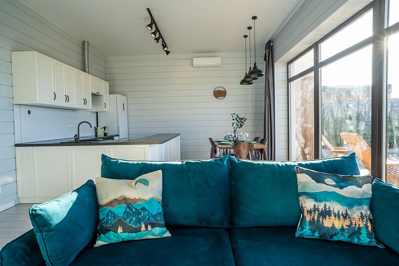 Доступны две спальни, кухня-гостиная, новая мебель, 8 спальных мест, сауна, мангальная зона, закрытая парковка на два автомобиля. Также во всех домах есть Wi-Fi, PlayStation 4, микроволновая печь, духовой шкаф, кофемашина, посудомоечная и стиральная машины, холодильник, кондиционер, телевизоры в каждой комнате, теплые полы.