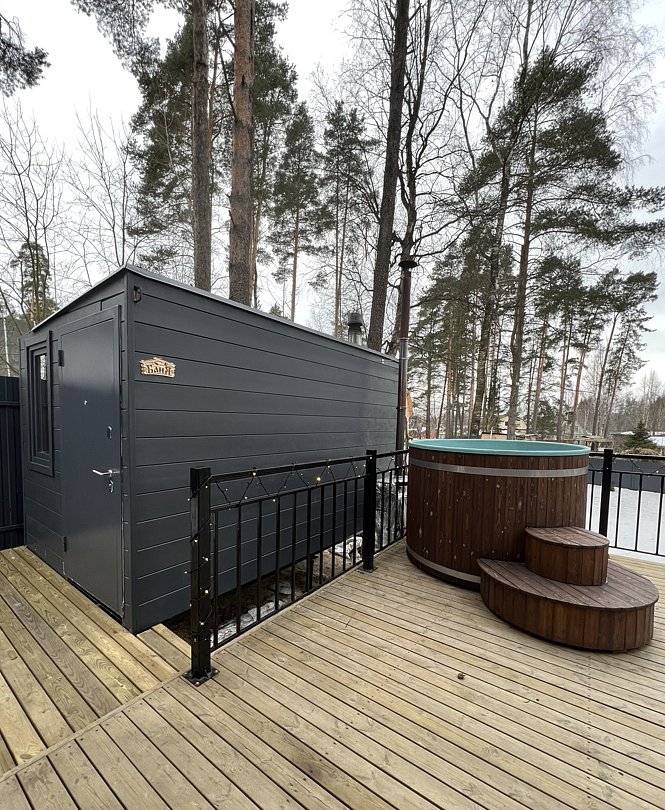 Каждый коттедж оснащен собственной террасой, на которой оборудованы купель на дровах под открытым небом.