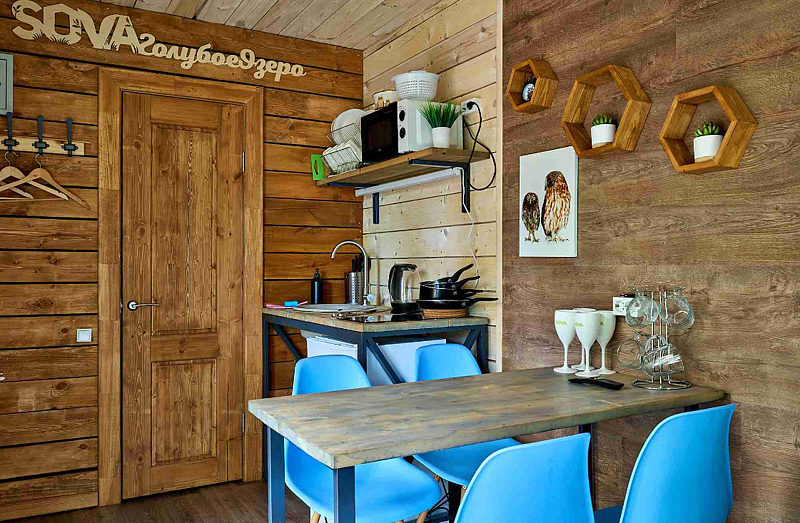 Отдыхающие могут приятно провести время на пляже озера Голубое, который находится всего в 2 минутах ходьбы пешком от домиков — там же можно позагорать и искупаться, что понравится как взрослым, так и детям. Для малышей также оборудована детская площадка.