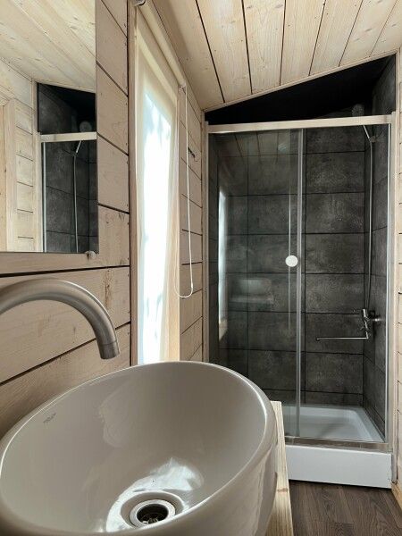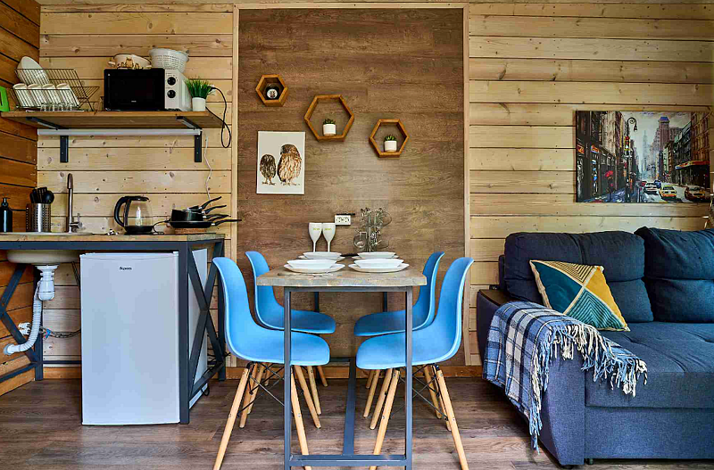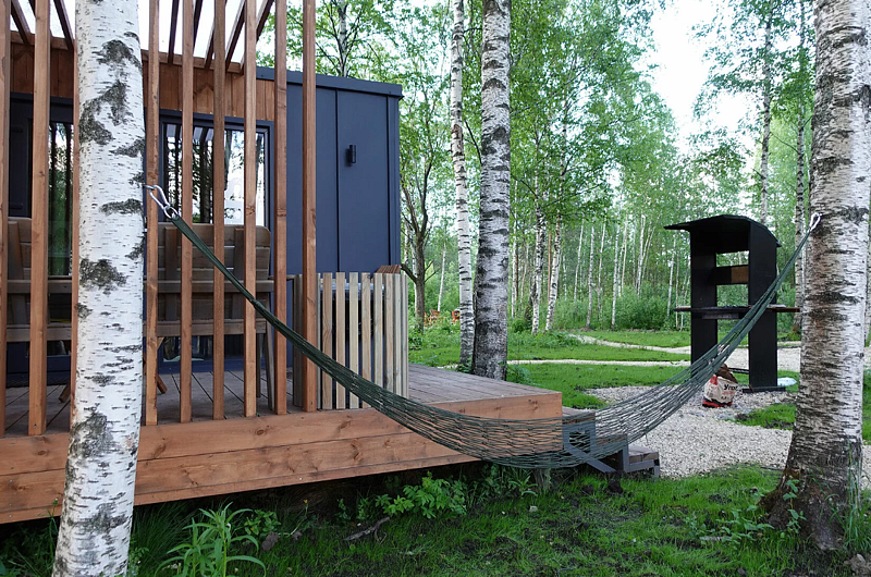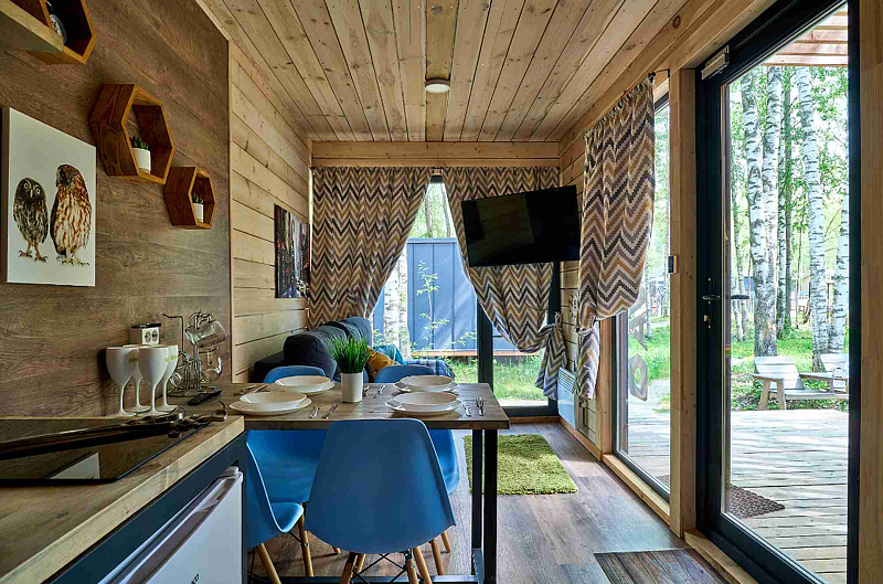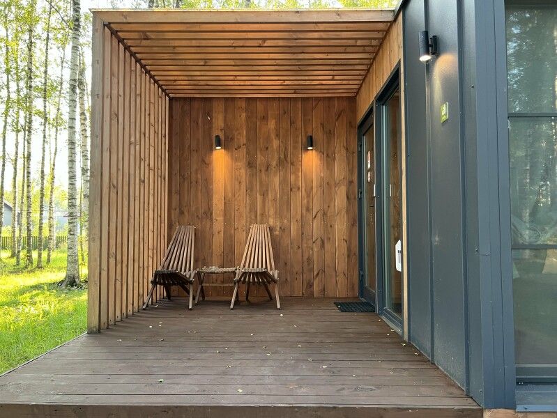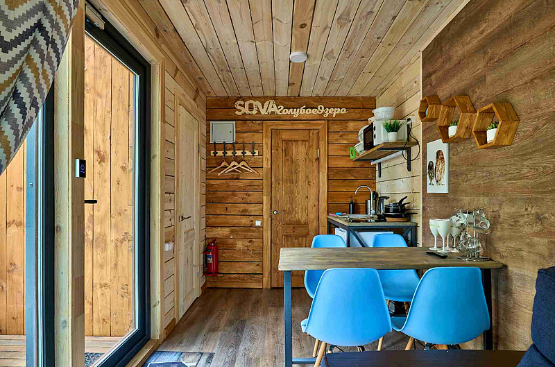 Гостям на выбор предлагаются два типа домиков, каждый из которых оснащен террасой с зоной отдыха и мангалом: «Дом Смарт для 2-4 человек» и «Дом Комфорт для 2-6 человек».