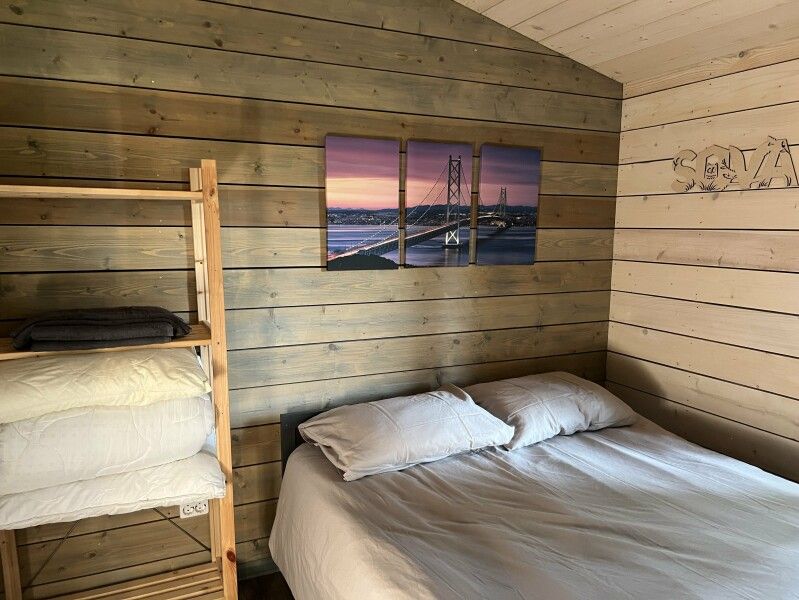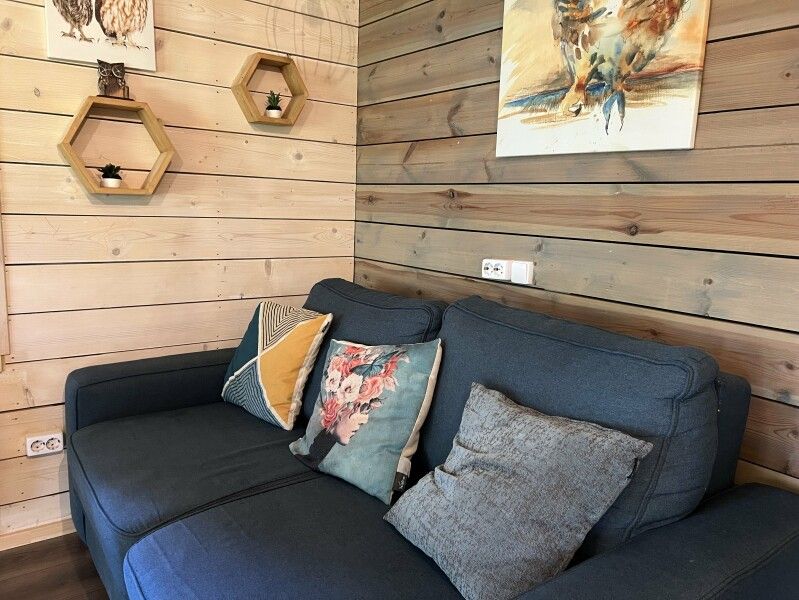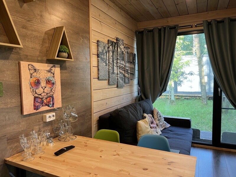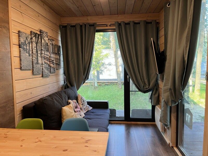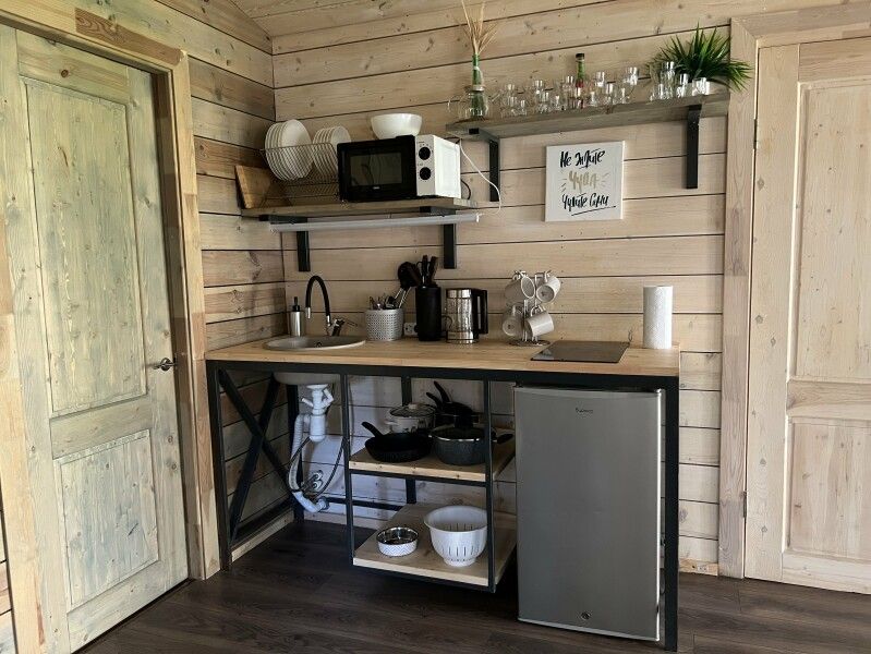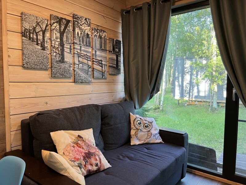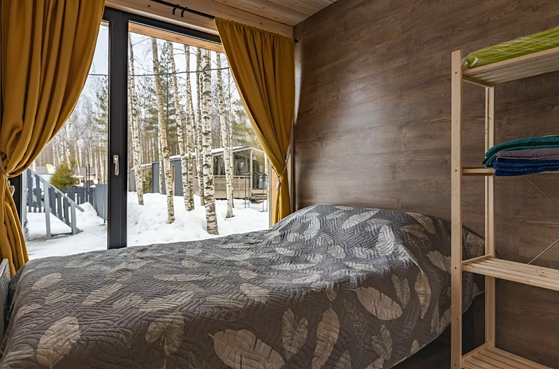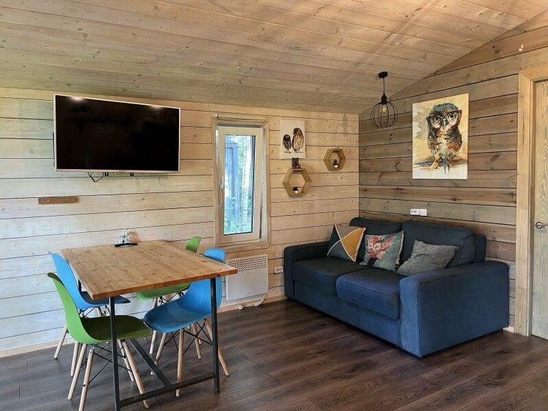 Небольшой уютный коттедж, где будет комфортно компании до 4 человек. В домике одна спальня с двуспальной кроватью, гостиная с диваном, кухонная зона.