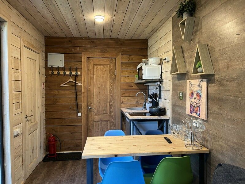 - мини-кухня со всем необходимым (микроволновка, холодильник, варочная панель, чайник, посуда);
