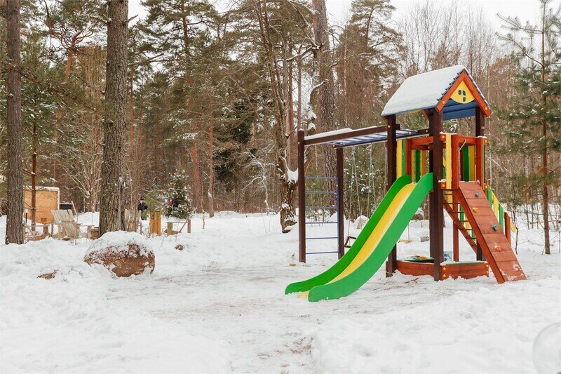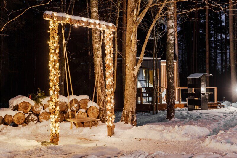 Каждый коттедж на локации оснащён садовой мебелью, мангалом и шампурами. Сушилки для обуви, хозяйственные принадлежности для уборки входят в стоимость.
