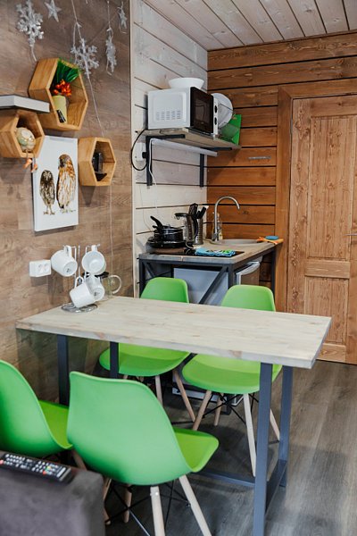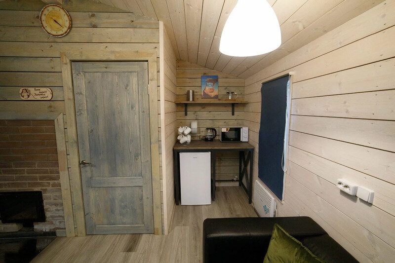 В гостиной оборудована кухонная зона с чайником, микроволновой печью, электроплитой и небольшим холодильником. В коттеджах - конвекторы. Ванная комната.