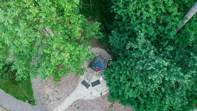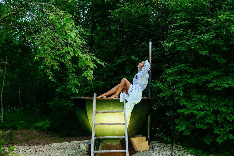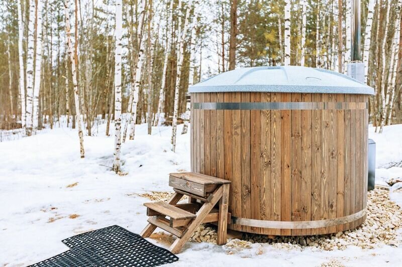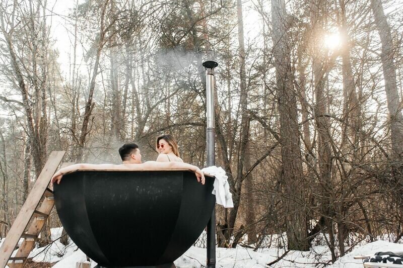 Горячие ванны на открытом воздухе. Печь дает возможность нагреть воду до нужной температуры, благодаря чему купание в чане комфортно даже в зимнее время года.