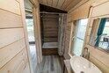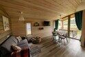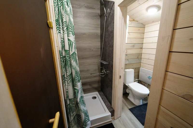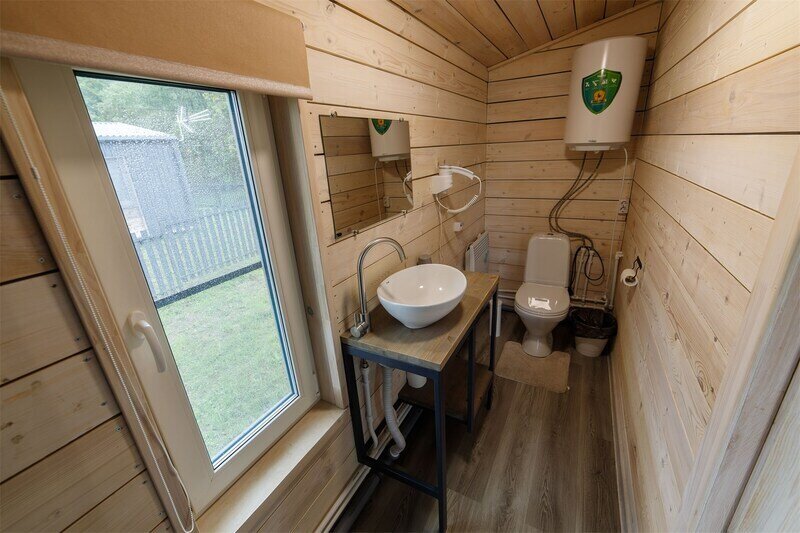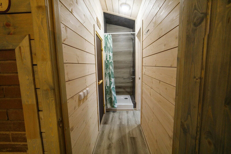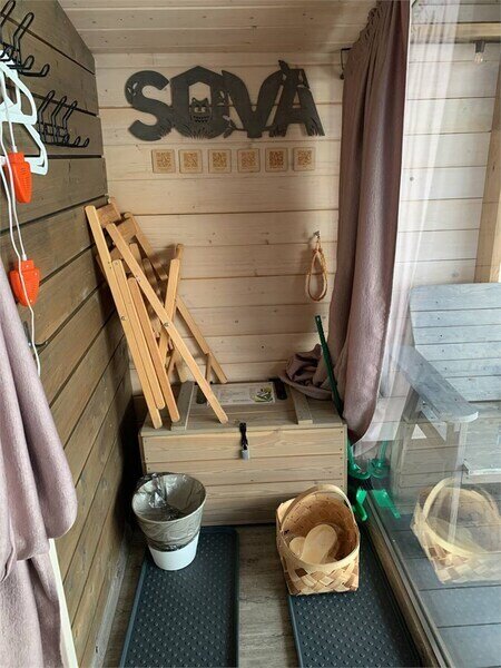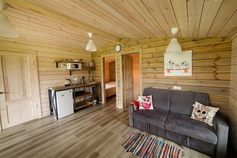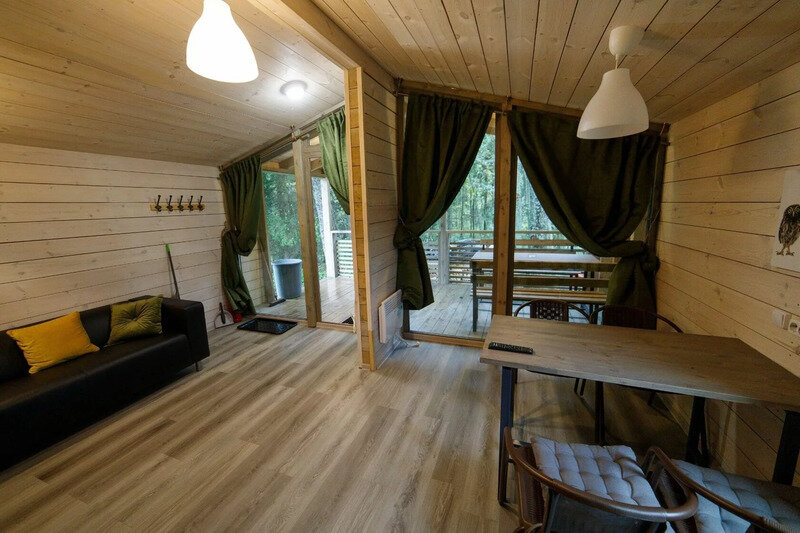 В банном доме есть кухонная зона с кулером, микроволновой печью, чайником и посудой, гостиная зона с панорамными окнами, столом, диваном и телевизором. Совмещенный санузел. Крытая терраса с уличной мебелью.