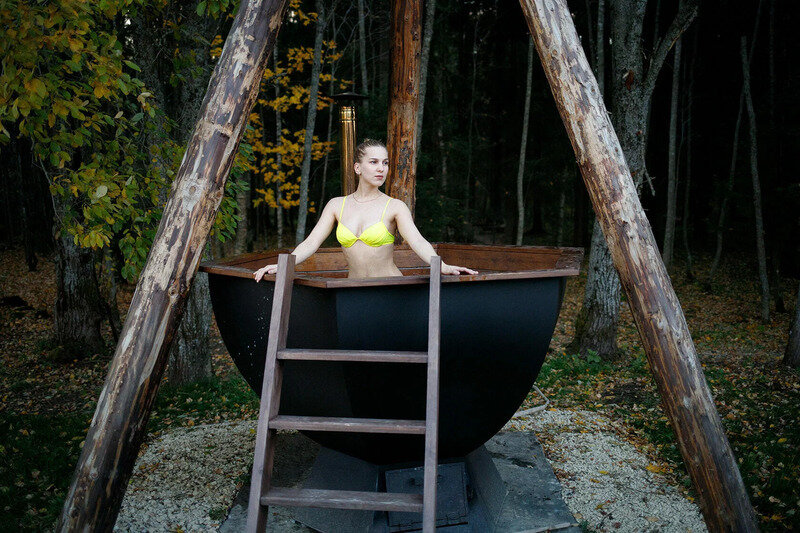 Горячие ванны на открытом воздухе. Печь дает возможность нагреть воду до нужной температуры, благодаря чему купание в чане комфортно даже в зимнее время года.