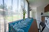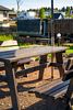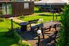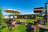 Рядом с беседкой стоит стол со стульями под зонтом для летних посиделок.