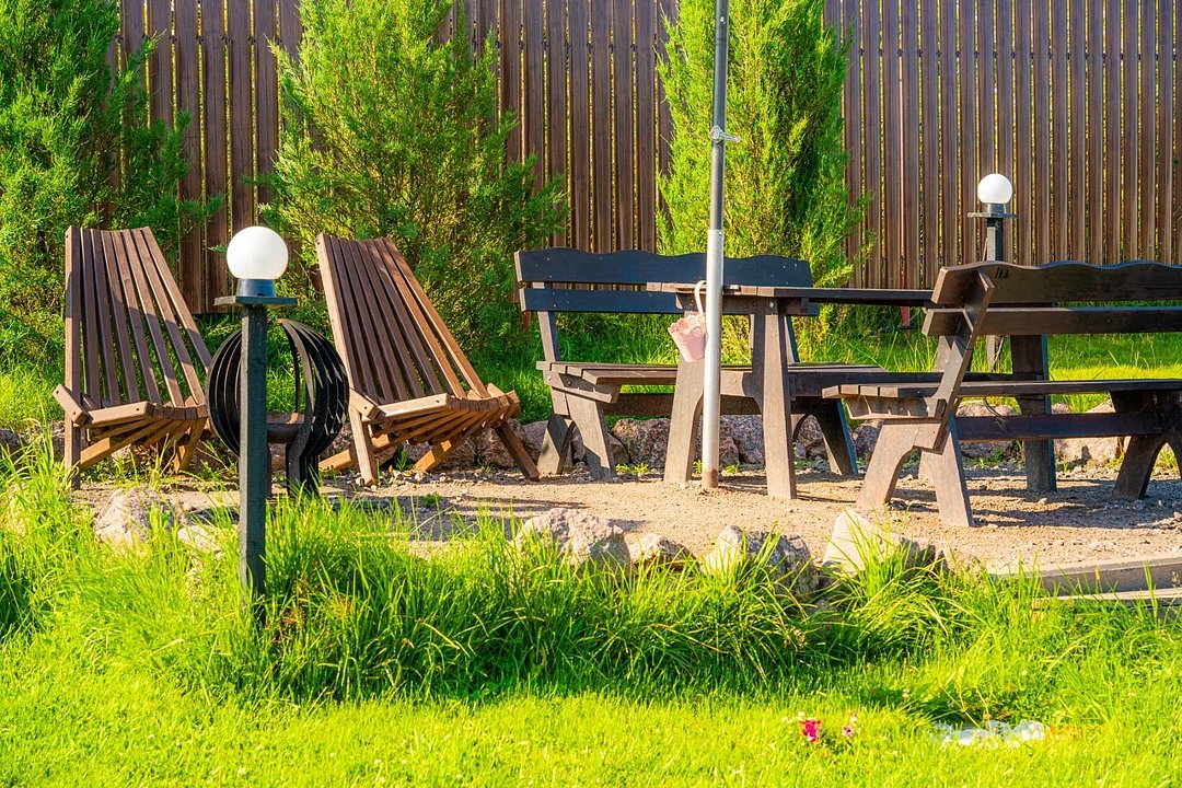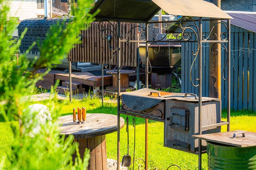 Решетки, шампура, коптильня, открытая барбекю зона.