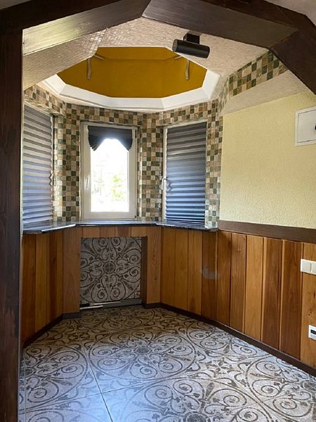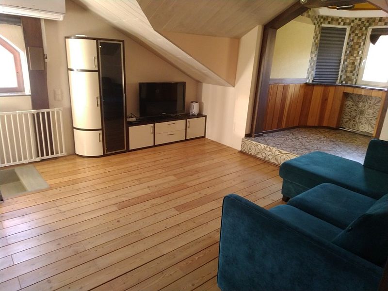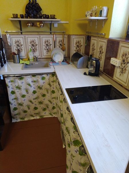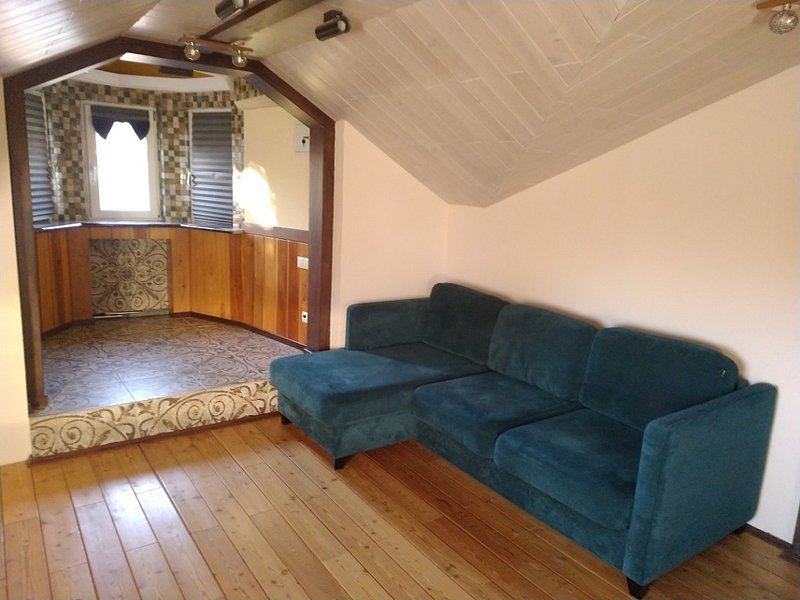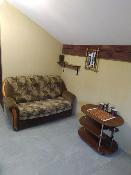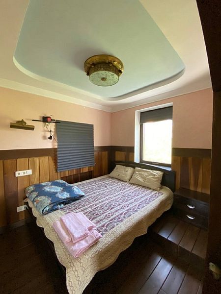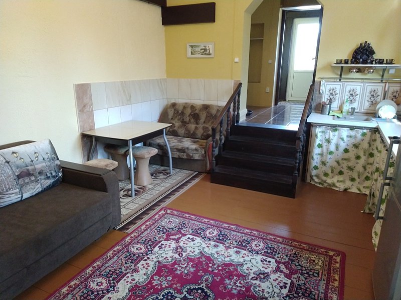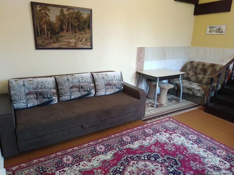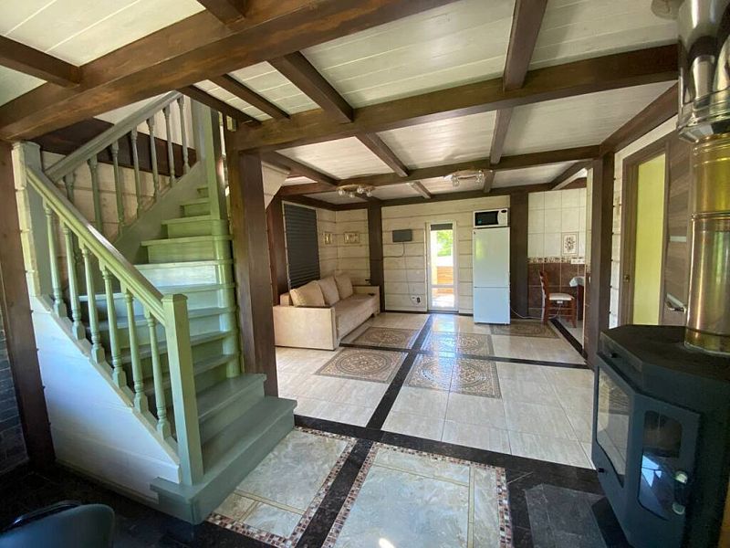 В коттедже: кухонная зона со всем необходимым для приготовления пищи. Для размещения предлагаются - одна двуспальная кровать и два дивана-кровати.
