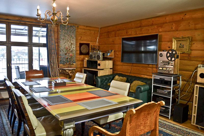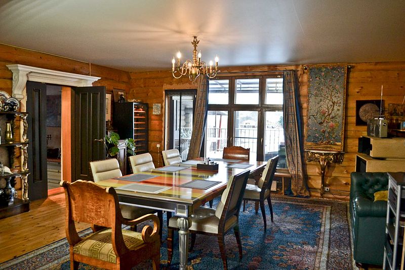 В доме: две большие общие зоны (столовая-гостиная) для комфортного времяпрепровождения большой семьей или компанией друзей, русская печь с барной зоной и окном напротив, баня, две террасы (одна на втором этаже, вторая прямо на берегу реки с шикарным видом и выходом из гостиной-столовой, меблирована обеденной зоной и кофейным столиком), мангал, винный шкаф, оборудованная кухня (холодильник, профессиональный широкий духовой шкаф, газовая плита, посудомоечная машина, два типа кофемашин, полные полки посуды и кухонной утвари, морозильная камера в подсобном помещении), уникальная акустическая система, также есть велосипеды, рыболовные снасти и настольные игры.