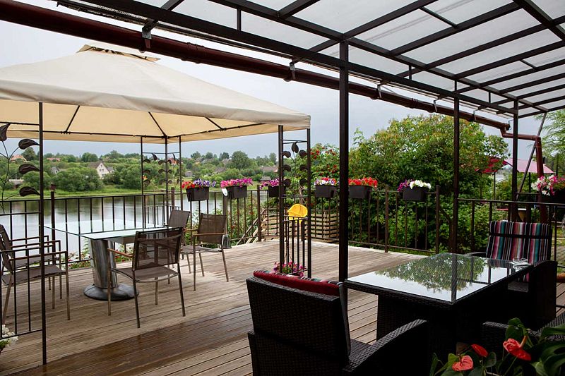 Две террасы — одна на втором этаже для тихого отдыха, загара, медитаций. Вторая прямо на берегу реки с шикарным видом и выходом из гостинной-столовой и Люкса, меблирована обеденной зоной и кофейным столиком на 2–3 человека, есть мебель для банкета.