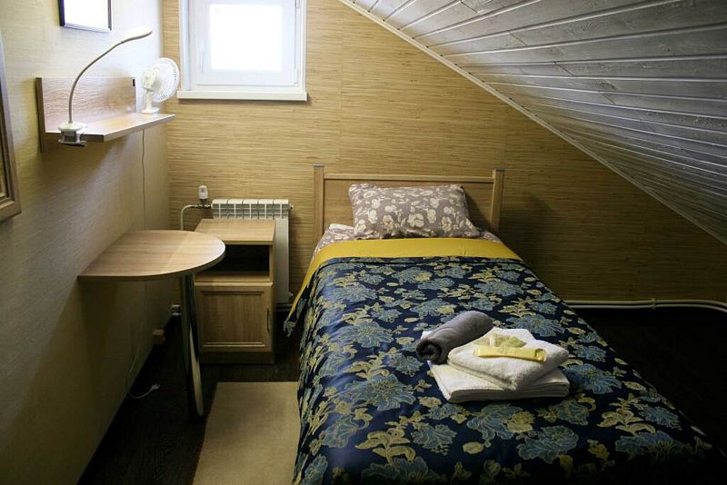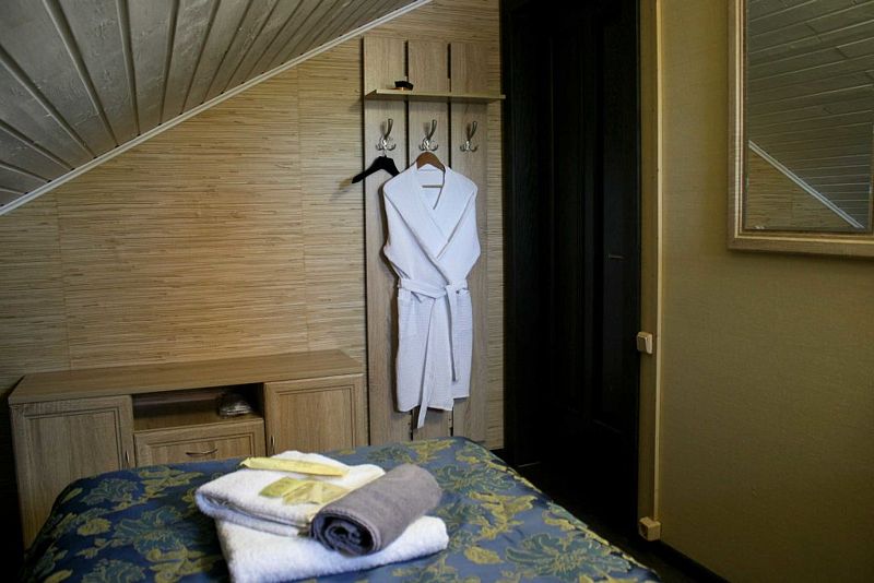 Двухкомнатный трехместный номер, односпальная кровать находится в мансарде. двуспальная - в основной комнате. Кухня располагается на первом этаже.