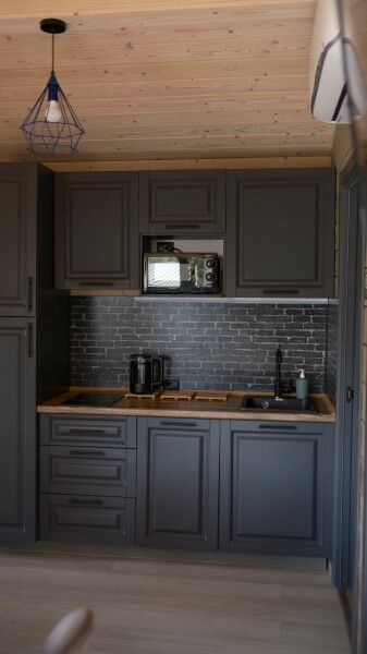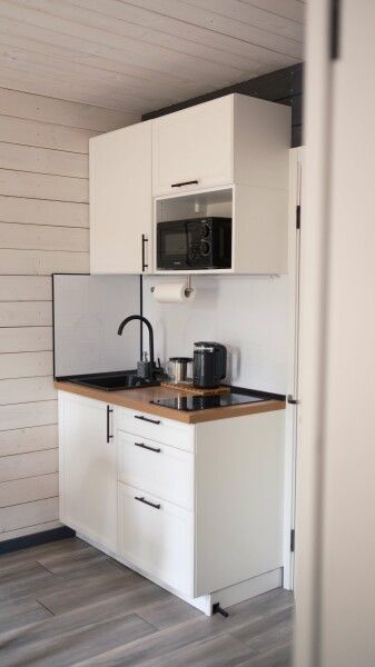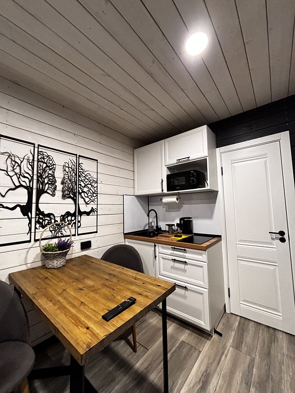 - мини-кухня со всем необходимым (микроволновка, холодильник, варочная панель, чайник, посуда);